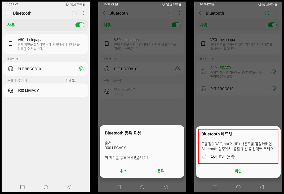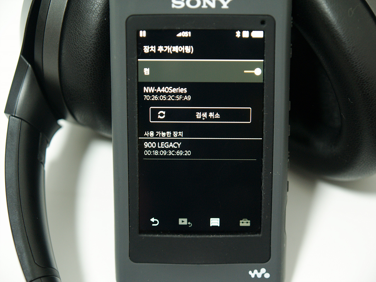 멀티 포인트 기능을 위해 다시 페어링 모드로 들어가서 또 다른 기기(DAP)와 연결을 해주었습니다. 현재 900 LEGACY 헤드폰은 LG 스마트폰 (V50) & 소니 DAP (NW-A45) 두개를 연결(페어링) 한 생태입니다. 이 상태에서 전원을 켜게 되면 전원이 켜지고 "Device connected" 라는 멘트가 연속으로 두번 나옵니다.
