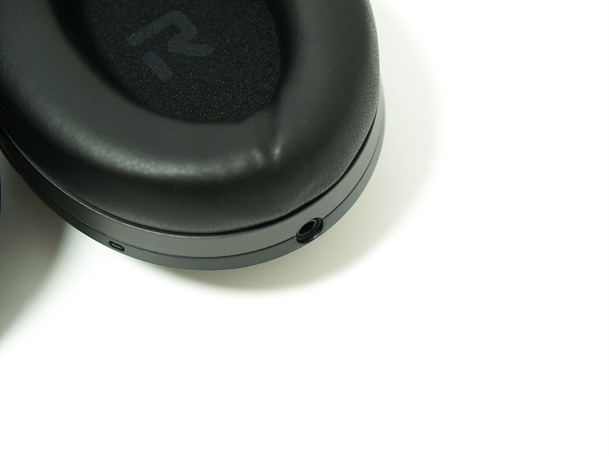3.5mm 유선 연결용 커넥터는 오른쪽 패드 부분에 있습니다. 3.5mm 케이블을 연결한 상태에서도 배터리가 남아있다면 노이즈 캔슬링 모드를 그대로 사용할 수 있습니다. 다만 충전용 USB 케이블을 연결하게 되면 자동으로 전원이 꺼져서 노이즈 캔슬링이나 트랜스패어런시 기능은 사용할 수 없습니다.