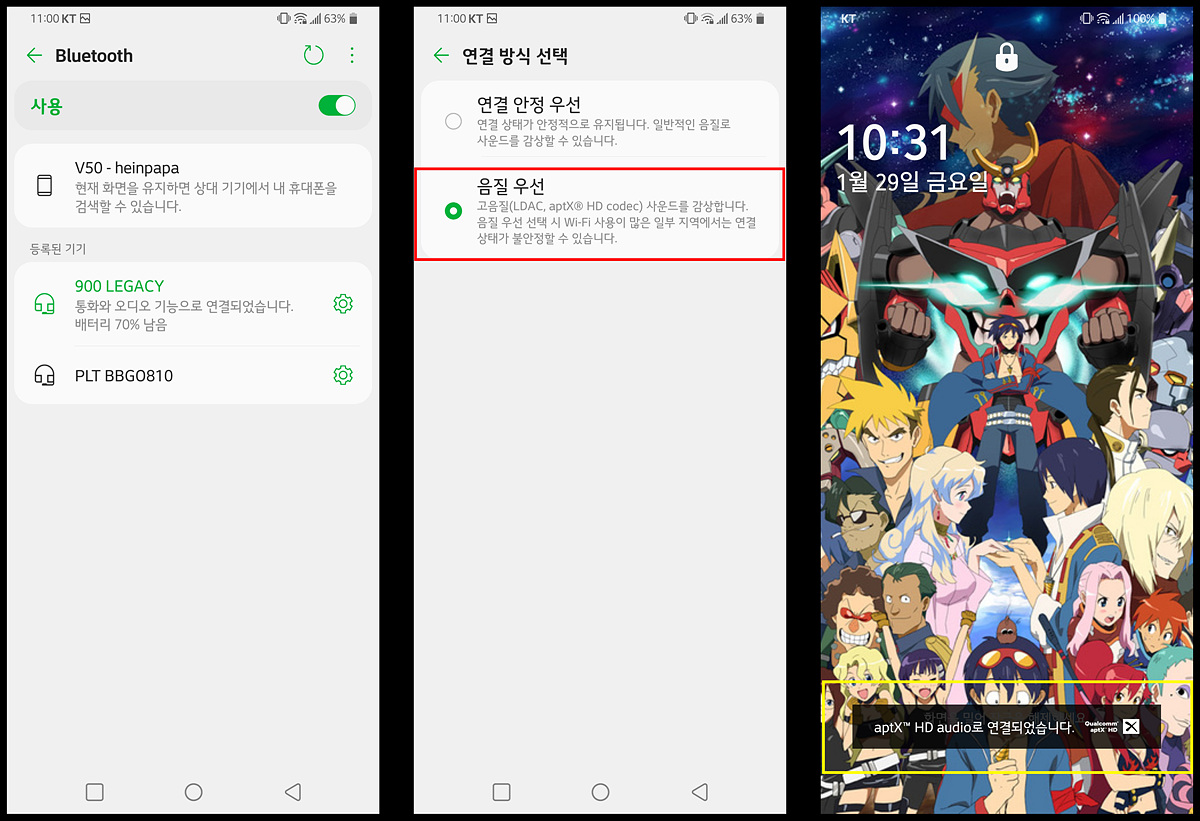 페어링이 된 후 연결 방식에서 연결 안정 우선이 아닌 음질 우선으로 바꿔주어야 합니다. 음질 우선으로 설정을 했다면 위 사진처럼 페어링을 하면서 자동으로 aptX HD로 연결이 됩니다.