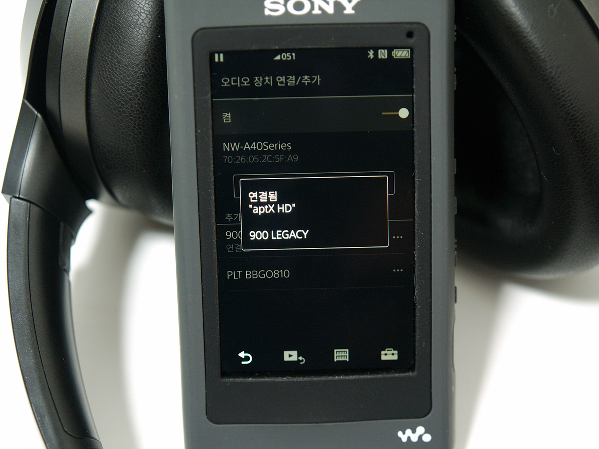 멀티 포인트 기능을 위해 다시 페어링 모드로 들어가서 또 다른 기기(DAP)와 연결을 해주었습니다. 현재 900 LEGACY 헤드폰은 LG 스마트폰 (V50) & 소니 DAP (NW-A45) 두개를 연결(페어링) 한 생태입니다. 이 상태에서 전원을 켜게 되면 전원이 켜지고 "Device connected" 라는 멘트가 연속으로 두번 나옵니다.