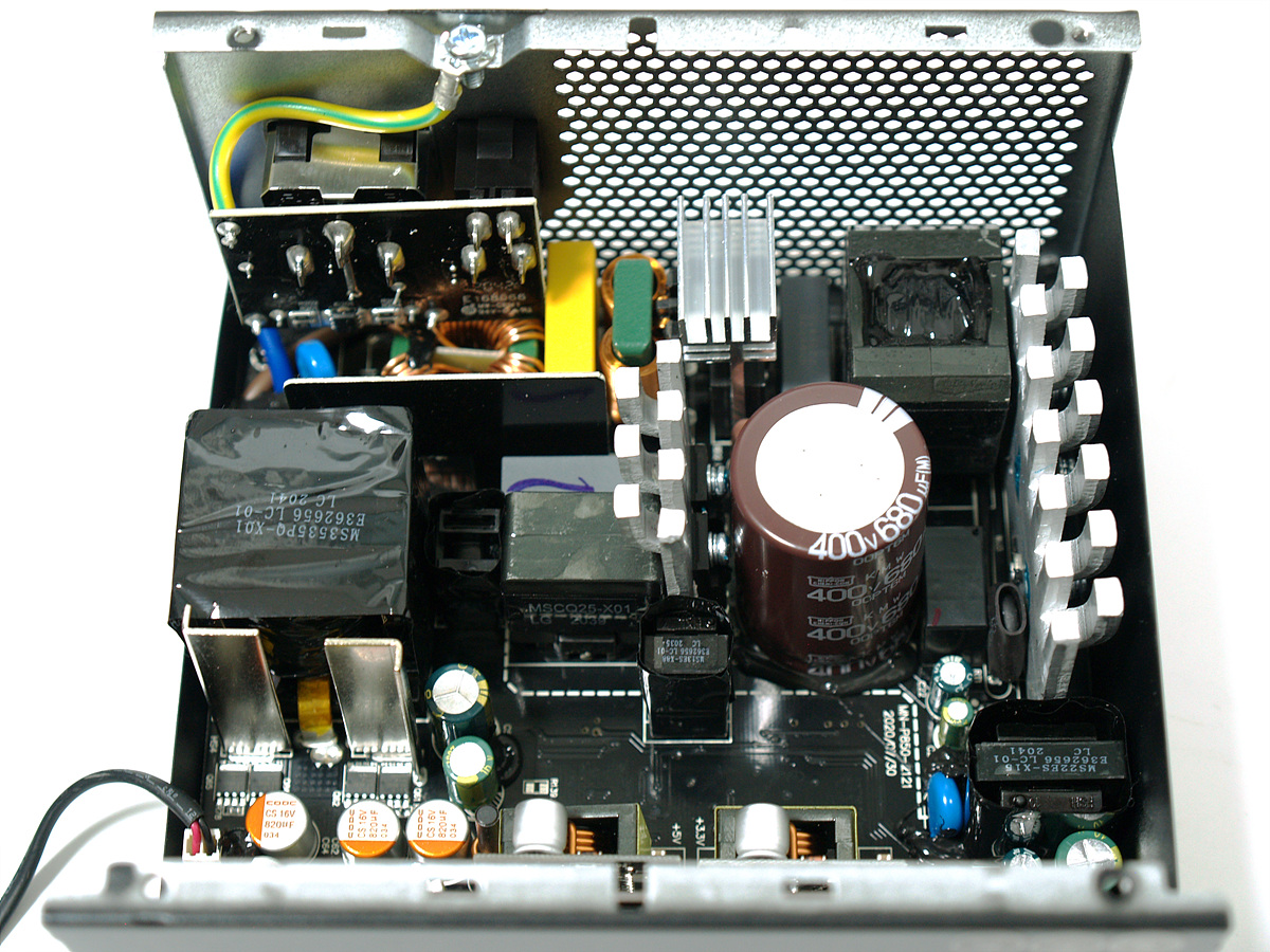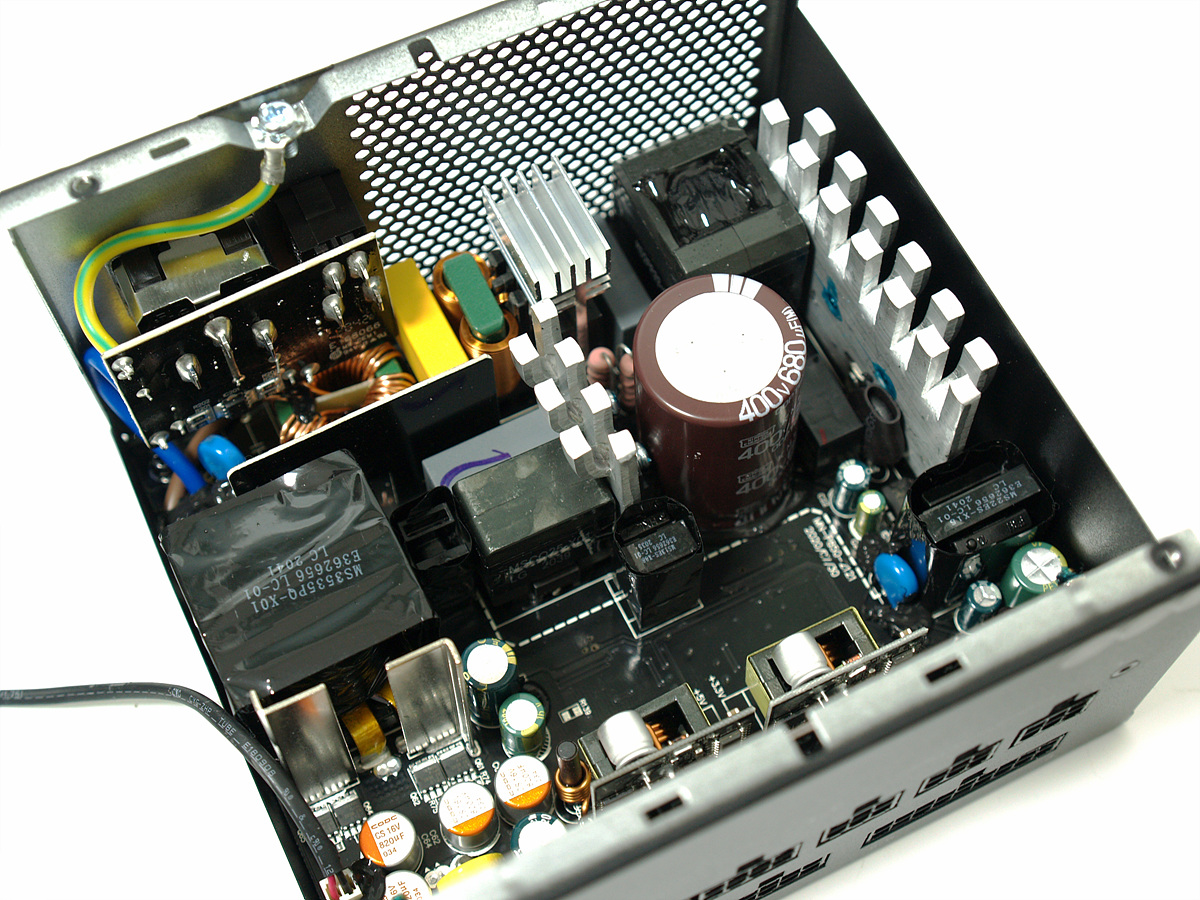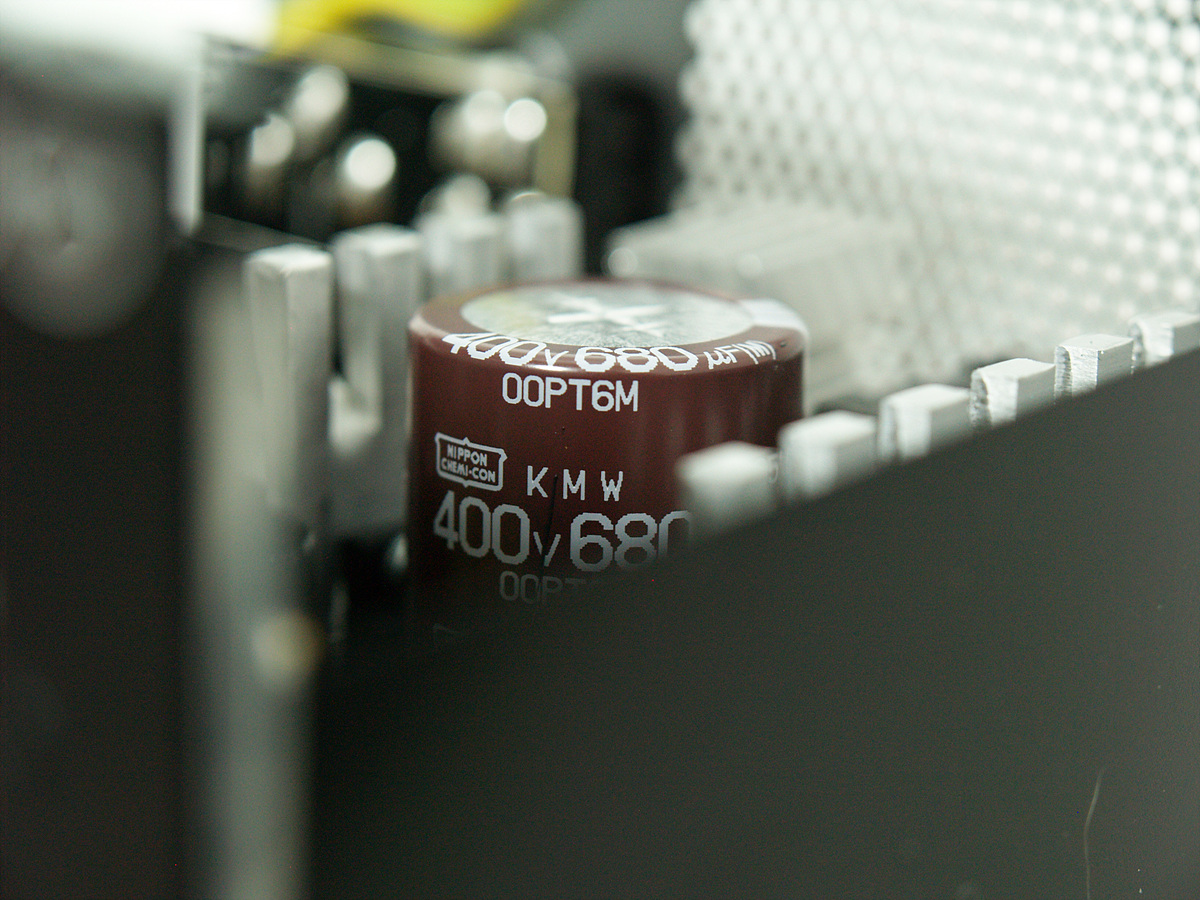 입력단에는 EMI 필터, AC to DC 변환을 위한 스위칭 트랜스, 액티브 방식의 PFC가 적용되었으며 메인 컨덴서는 일본산 400V 680uF(마이크로 패럿) 콘덴서가 장착되었습니다.