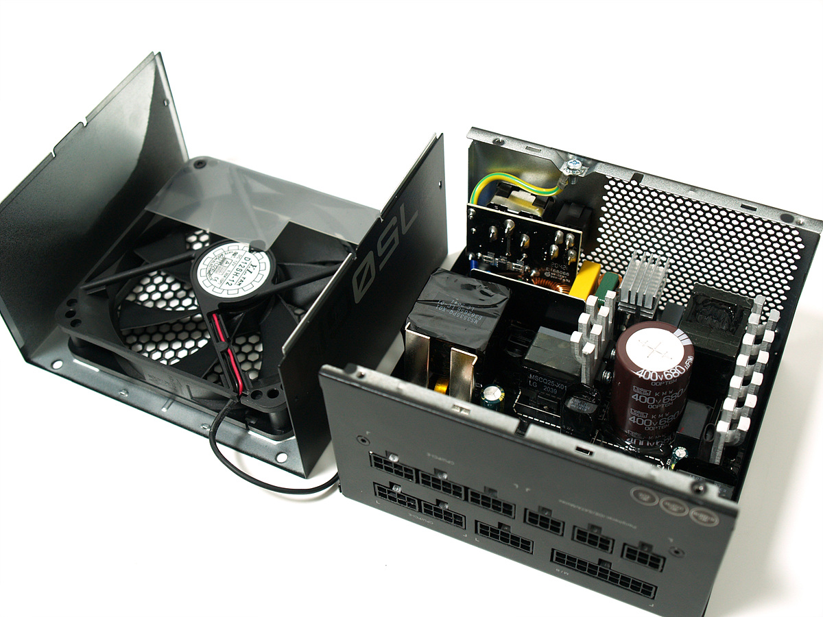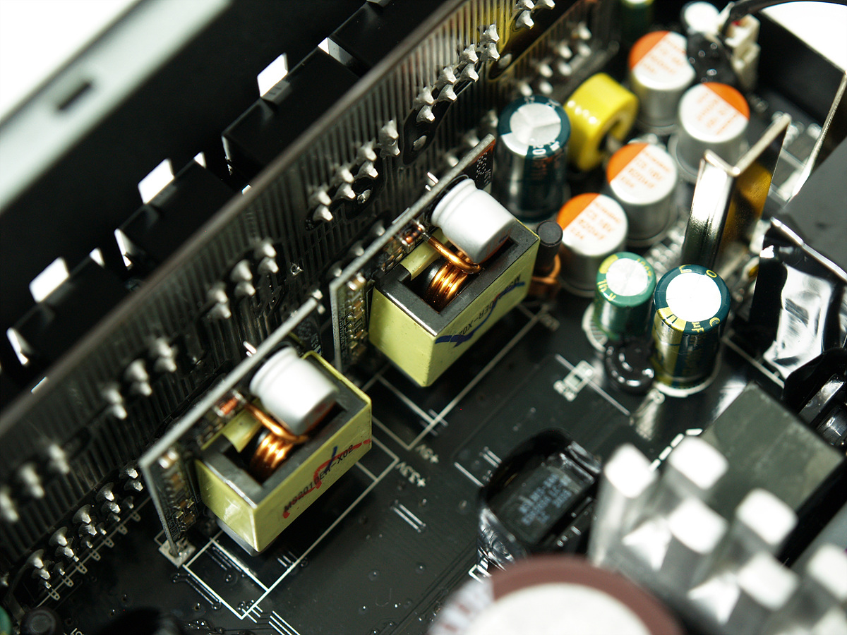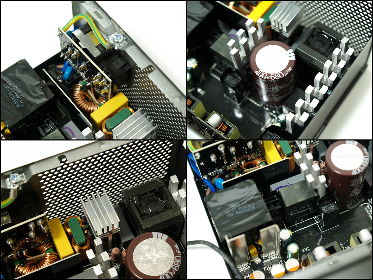 입력단에는 EMI 필터, AC to DC 변환을 위한 스위칭 트랜스, 액티브 방식의 PFC가 적용되었으며 메인 컨덴서는 일본산 400V 680uF(마이크로 패럿) 콘덴서가 장착되었습니다.