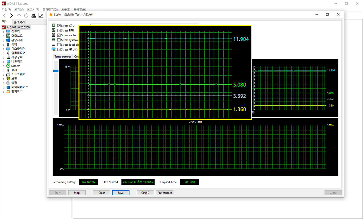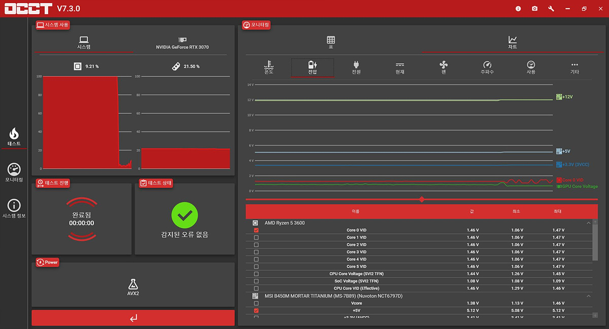 파워 테스트는 OCCT / AIDA64로 테스트를 해보았습니다. 사실 이런 테스트는 큰 의미는 없습니다. 파워의 경우 전문적인 장비로 해야하는 부분이라 소프트웨어나 가정에서 사용하는 멀티 테스터기 측정은 신뢰도가 매우 낮으니 그냥 참고용으로만 봐주시기 바랍니다. (개인적으로 파워 테스트를 어려워 하는 이유이기도 합니다.)