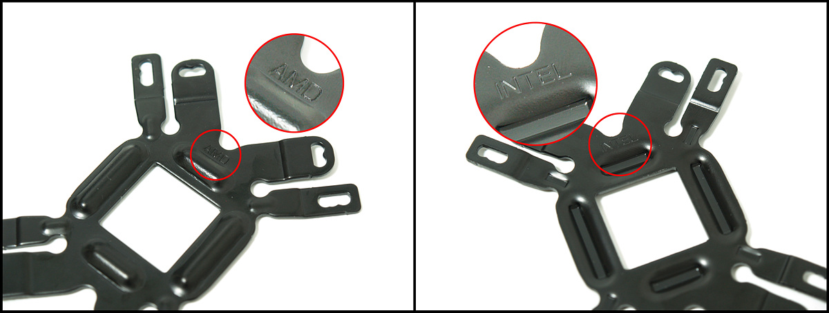 메인보드 뒷쪽에 장착하는 백플레이트는 Intel / AMD 공용으로 사용하고 있으니 앞뒤 방향을 꼭 살펴보시기 바랍니다. 홈의 돌기 부분도 다르고 사진처럼 글자로 구분되어 있으니 설치하실때 꼭 확인하시기 바랍니다.