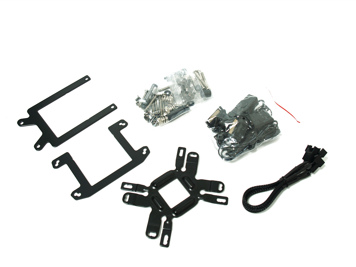 3열 라디에이터 + 펌프, 3개의 쿨러와 조립에 필요한 다양한 부품과 설명서로 구성이 되어있습니다. 일반적인 공랭 쿨러에 비해 수랭쿨러는 부속품이 상당히 많은편이니 조립할때는 설명서를 꼼꼼하게 읽어보시길 바랍니다.