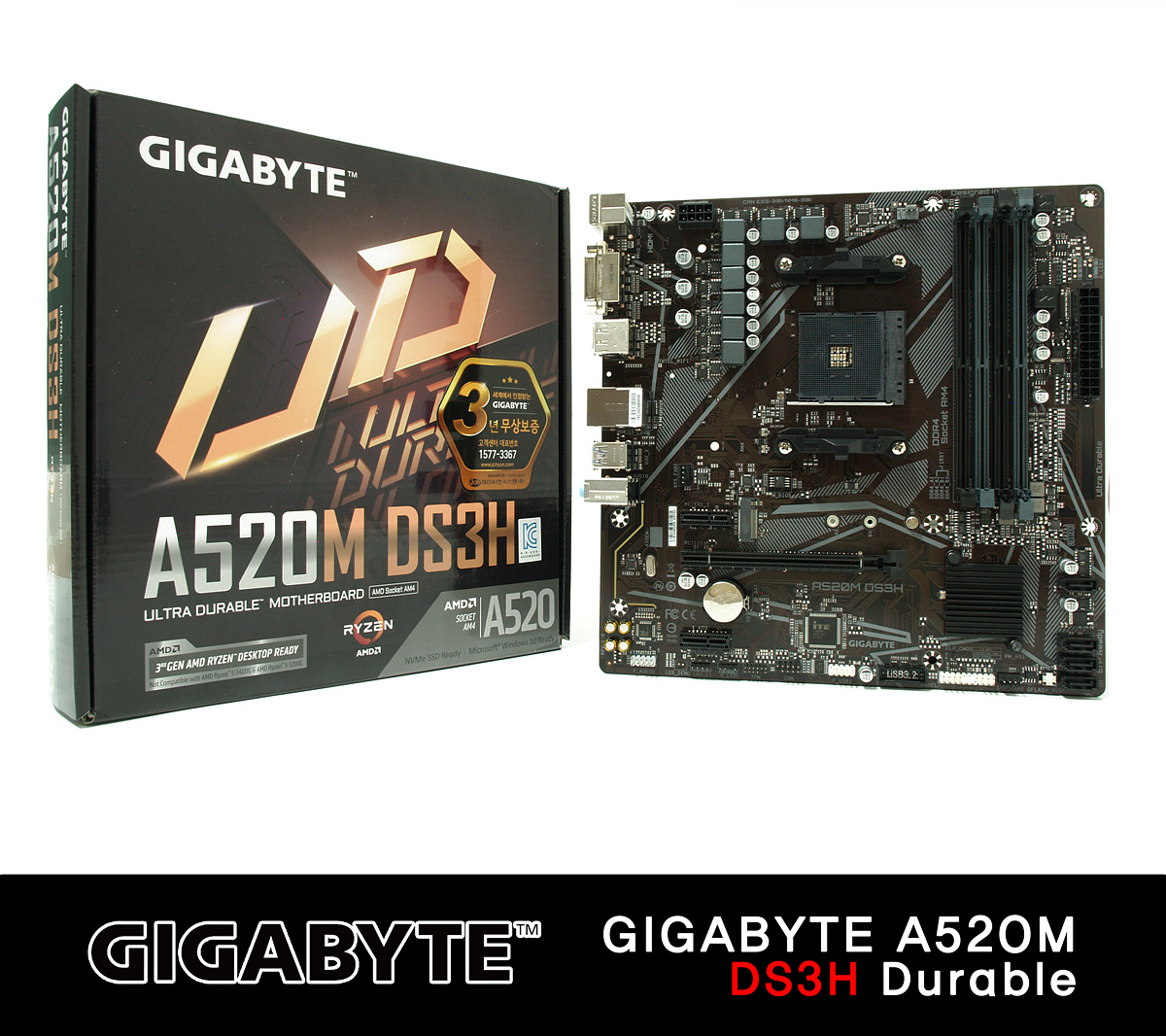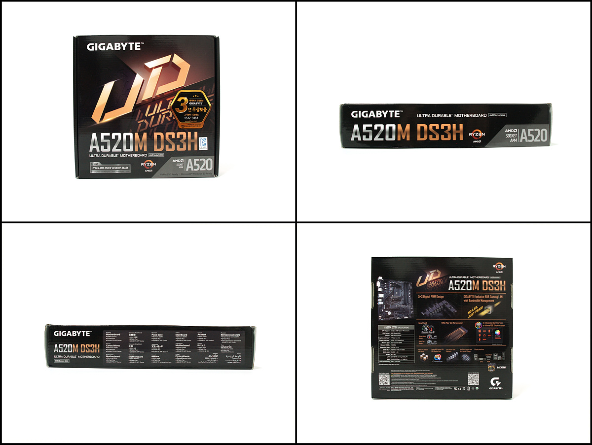 작년 라이젠 3세대 APU인 르누아르 발표 후 이를 사용할 수 있는 다양한 메인보드들이 출시가 되었습니다. AMD의 APU는 이전부터 인텔의 내장 그래픽보다는 훨씬 좋은 성능을 보여주어서 시장의 반응이 상당히 좋았습니다. 개인적으로는 이런 APU들과 가장 잘 어울리는 메인보드는 AMD의 엔트리급이라고 할 수 있는 A 라인업이라고 생각합니다. 내장 그래픽이 있어서 추가로 VGA를 장착할 필요가 없고 업무용으로도 충분하고 롤(LoL)과 같이 낮은 사양의 게임을 즐기기에도 전혀 손색이 없기 때문이죠. 이번 시간에 소개하는 기가바이트 A520M DS3H는 이런 A520 칩셋을 사용한 메인보드로 작년에 출시했던 A520M S2H 제품에서 몇가지 기능을 조금 더 업그레이드한 메인보드입니다.