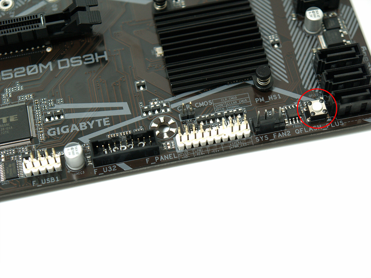 오른쪽 빨간색 동그라미 Q Flash Plus 버튼 역시 이전 제품과 달라진 부분입니다. 바이오스 업데이트를 위한 버튼으로 이전에는 뒷쪽의 IO 패널에 있었는데 이번에는 보드 안쪽으로 위치가 바꾸었습니다. 이 기능은 보통 중급형 이상에서만 적용이 되는 기능인데 기가바이트에서는 보급형 라인까지 적용이 되었습니다. 후면 패널에 있을때는 사용하기 편할 수 있지만 USB 기기나 LAN 포트 연결시 눌러지는 오동작을 막기 위해서 보드 안쪽으로 이동을 시킨거 같습니다. 자주 사용하는 버튼은 아니라 이 부분이 불편하거나 단점으로 생각되지는 않았습니다.
