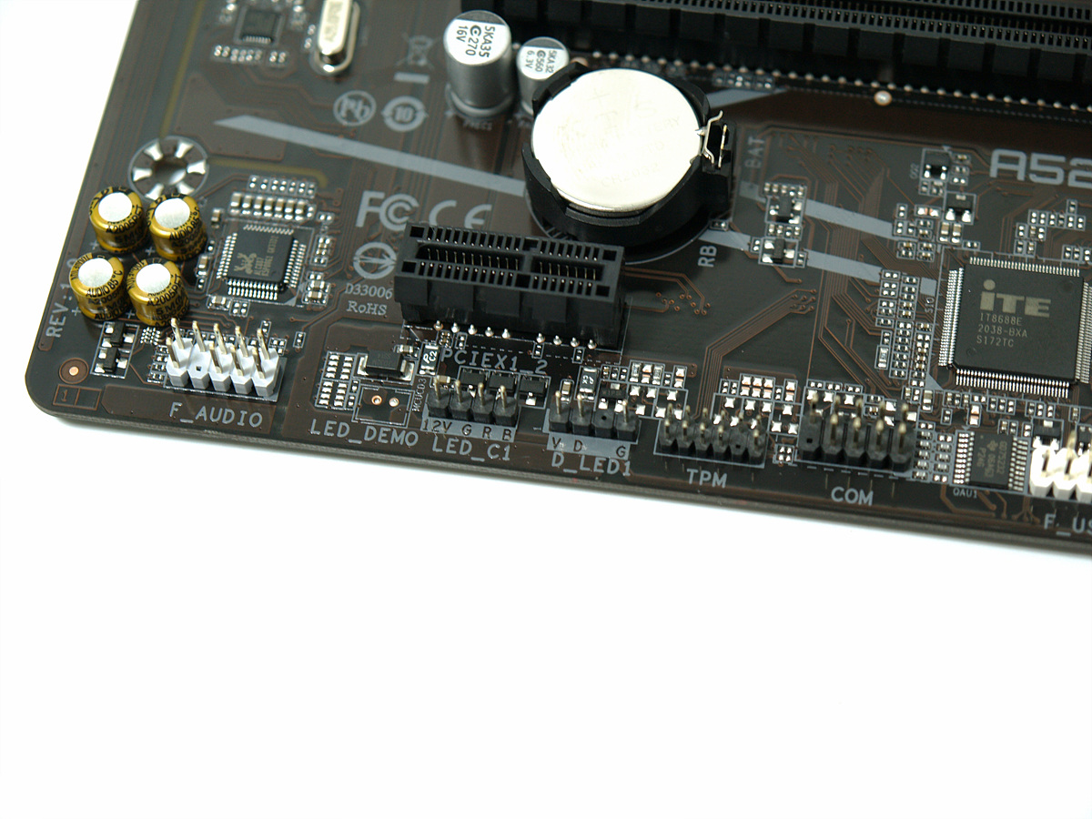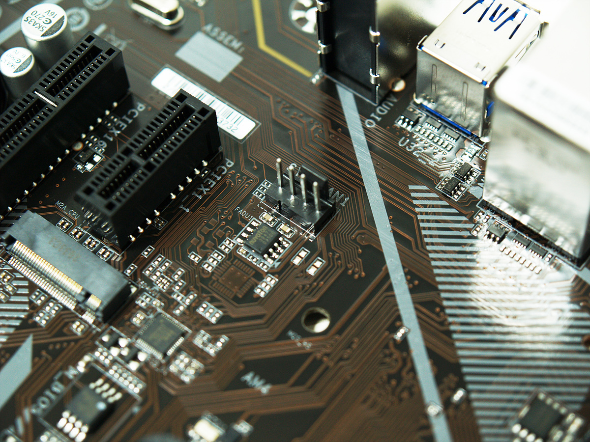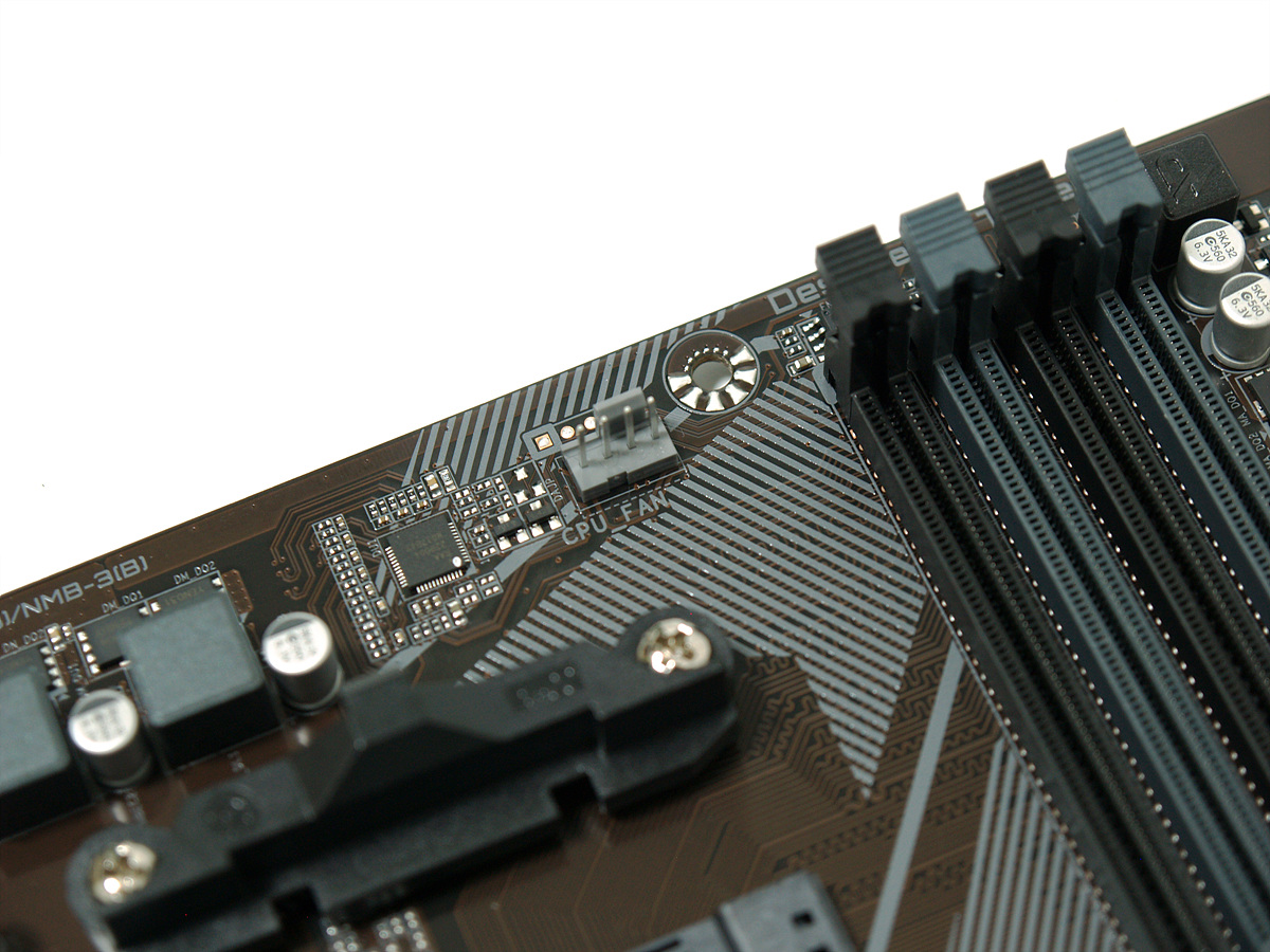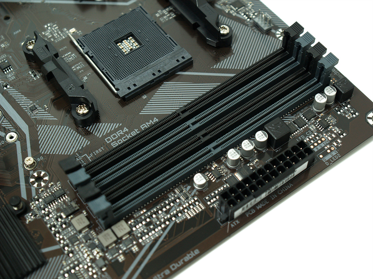 보드 레이아웃에서는 메모리 슬롯의 추가가 눈에 띄었습니다. 슬롯당 32GB로 최대 128GB까지 장착할 수 있습니다. 현재 메모리는 DDR4 8GB를 가장 많이 사용하고 있는데 A520 라인업 특성상 8GB를 4개 장착하는 분들은 거의 없겠지만 그래도 없어서 장착을 못하는것과 안하는건 큰 차이가 있겠죠. 사용하는 환경에 따라 메모리를 많이 사용해야 되는분들에게는 좋은 선택지가 될겁니다. 개인적으로도 메모리 슬롯(뱅크)은 무조건 4개가 되어야 뭔가 심리적으로 안정이 되기도 합니다. 메모리 슬롯 옆에는 24핀(20+4) 메인 전원 커넥터가 있습니다.