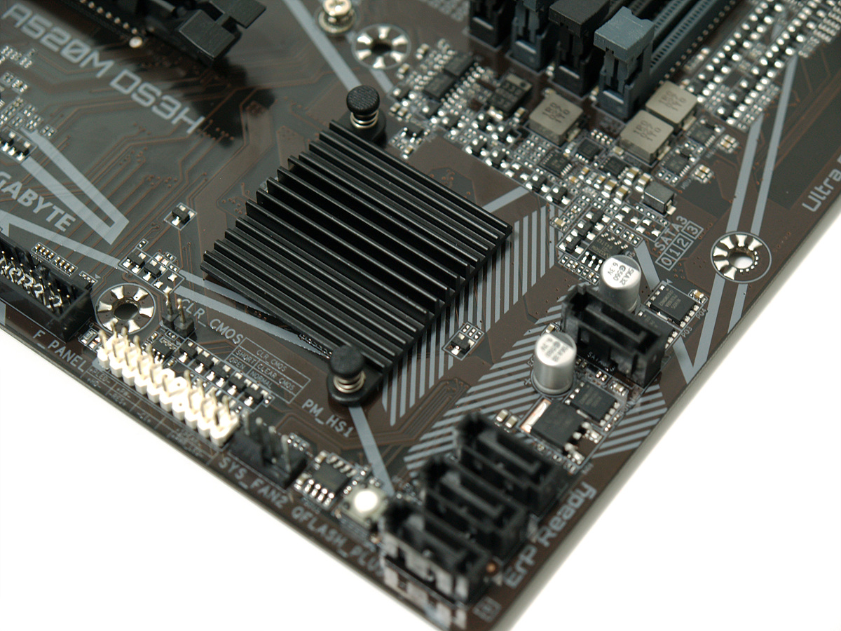 A520 칩셋 방열판은 푸시핀으로 되어있으며 그 옆에는 4개의 SATA 포트가 있습니다.