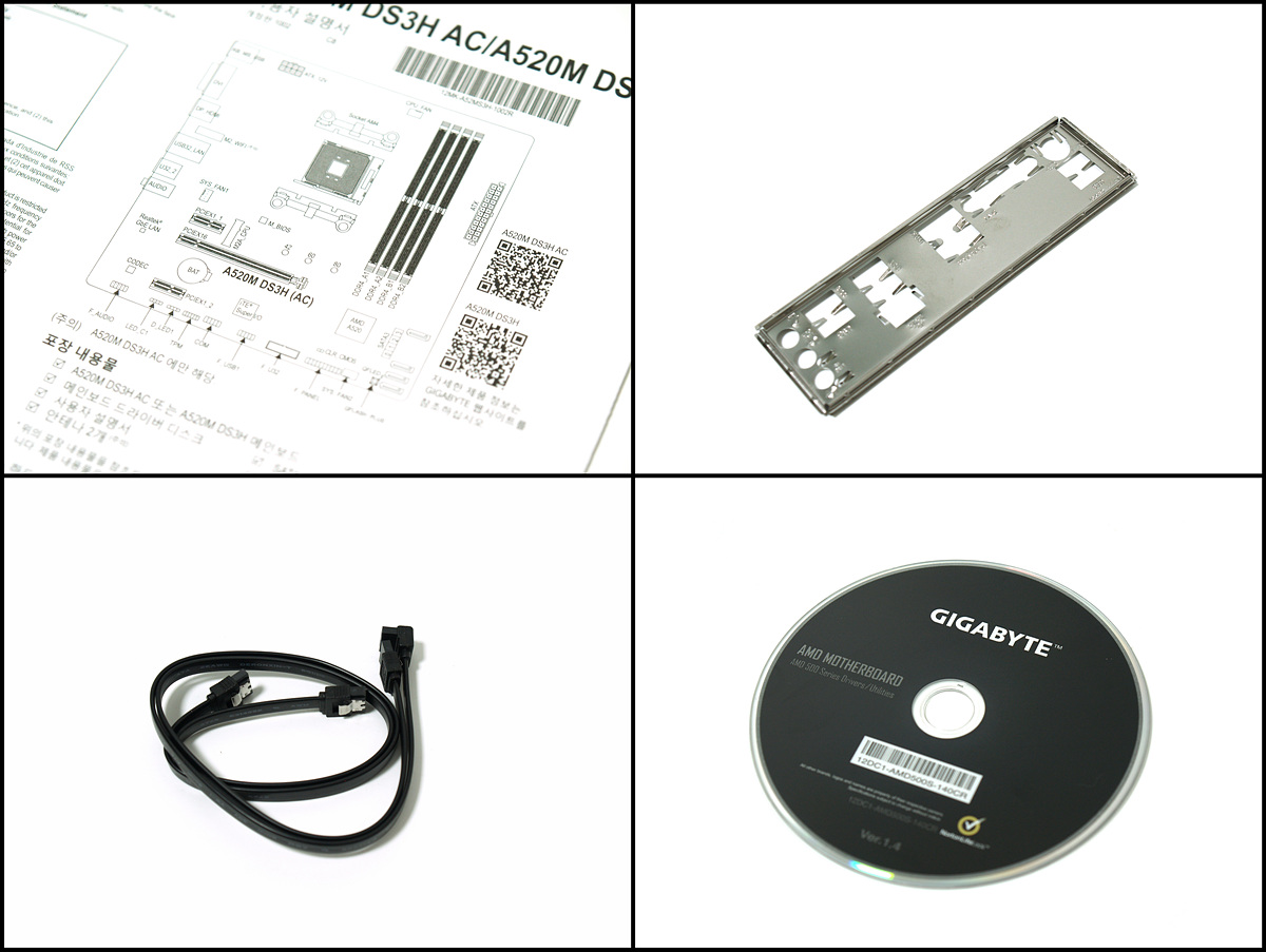 메인보드와 백 패널(I/O 패널), SATA 케이블 두개, 설치용 CD, 설명서가 포함되어 있습니다. 구성품이 조금 빈약해보이지만 보급형 라인에 맞게 딱 필요한 제품들만 포함되어 있습니다.