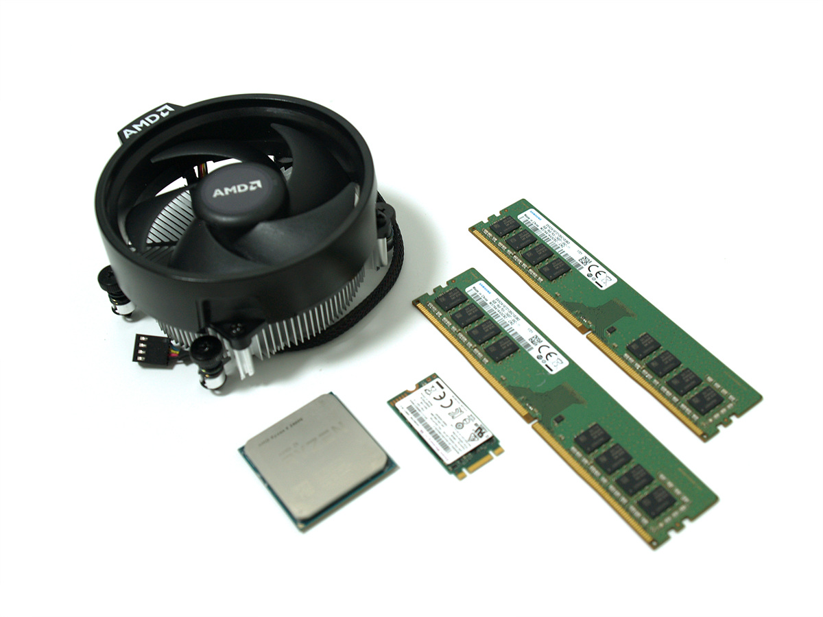 메인보드 테스트에 사용할 부품들입니다. (AMD 2400G, 삼성 8GB 메모리 두개, M.2 SSD)