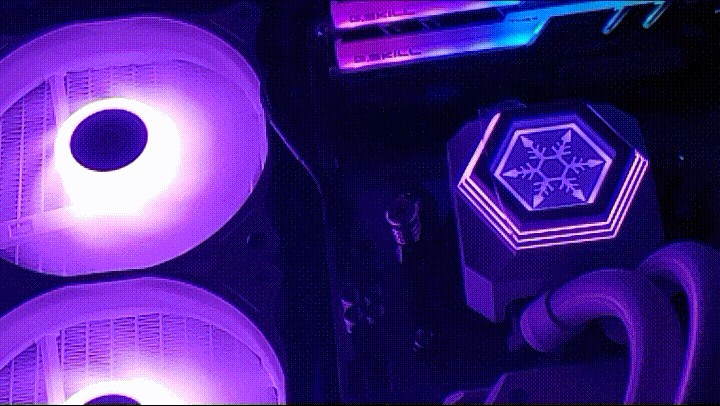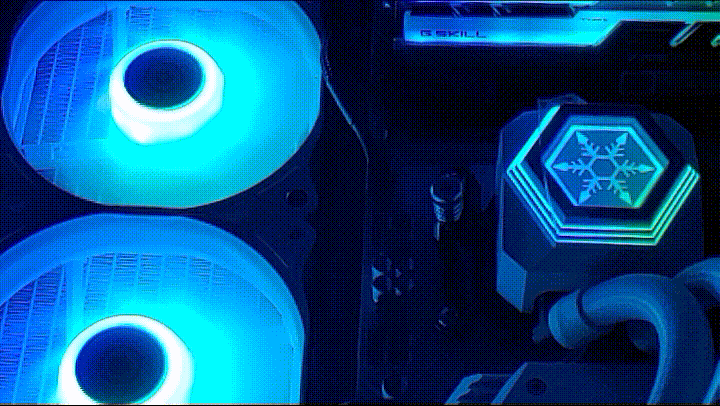 제가 테스트한 시스템이 오픈 케이스로 쿨러의 rpm과 온도에 있어서는 조금 유리한 편이니 이런 부분은 감안해서 봐주시기 바랍니다. 반대로 쿨러의 소음은 일반 케이스를 사용할때보다 더 민감한편인데 이전에 테스트했던 IceGem과 거의 동일한 수준이였습니다. 아이들시에는 귀를 바짝대고 들어야 살짝 들리는 정도였고 풀로드시 소음은 있었지만 제가 사용하는 RTX 3070 보다는 조용했습니다. RGB 효과뿐 아니라 쿨러의 기본기라고 할 수 있는 쿨링 (온도, 소음)은 모두 만족스러웠습니다.