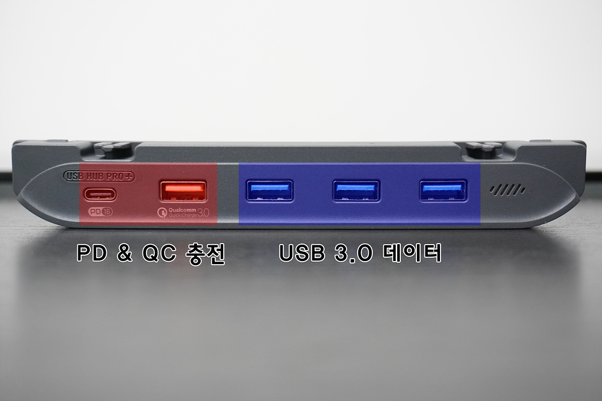 이 제품의 핵심이라고 할 수 있는 USB 허브입니다. 오른쪽 3개의 포트는 데이터용(USB 3.0)이고 왼쪽의  두개는 충전을 위한 포트입니다. PD 포트는 최대 18W까지 사용할 수 있으며 스마트 폰이나 태블릿, 닌텐도 스위치에는 사용할 수 있지만 노트북과 같이 높은 용량을 필요로 하는 곳은 사용할 수 없습니다. (충전이 느리게 될 수도 있고 충전이 아예 안될 수도 있습니다.)
