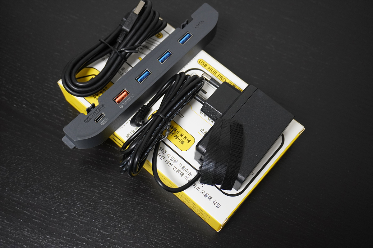 USB 허브와 PC 연결용 케이블, 충전용 외장 어댑터, 선정리용 벨크로(3개)가 포함되어 있습니다.