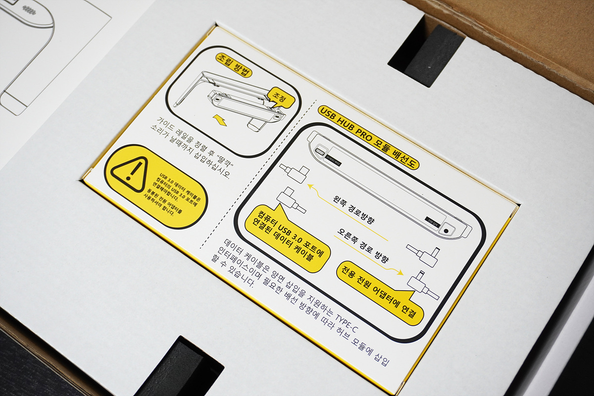 USB 허브 역시 안쪽에서 바깥족으로 딸각 소리가 날때까지 밀어넣으면 쉽게 설치할 수 있습니다. 허브는 양쪽 지지대와는 달리 위치만 잘 잡아주면 힘들이지 않고 빠르게 조립과 분해를 할 수 있습니다.