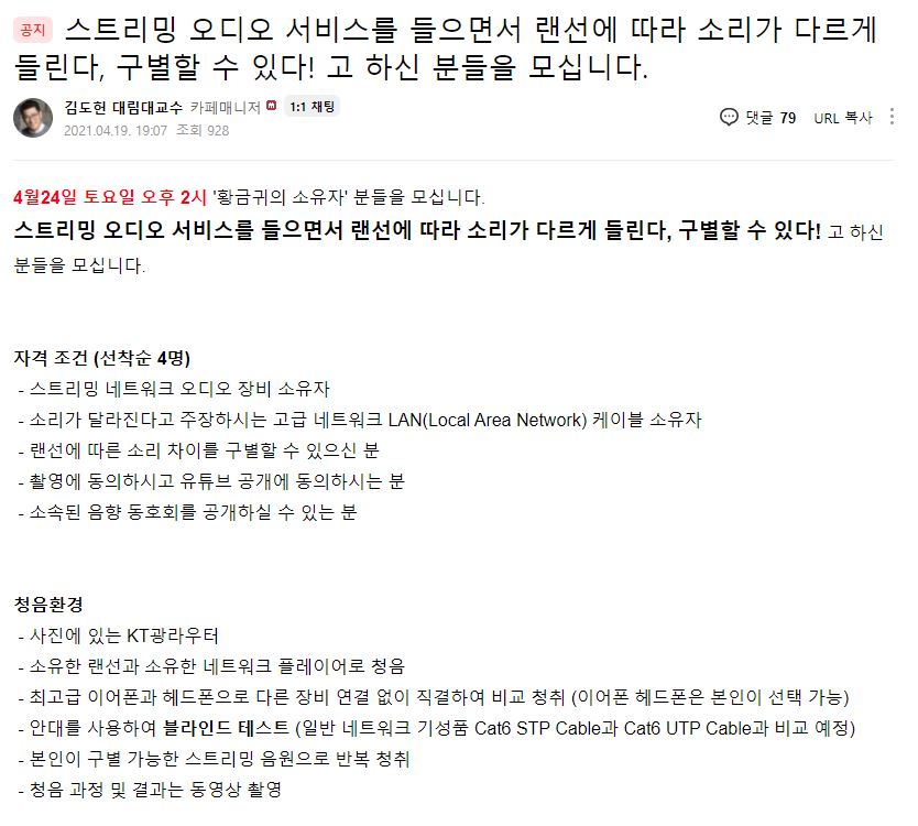 들어보면 판이 바뀔정도로 소리가 달라진다면서 왜 아무도 신청을 안한건지? 교수님이 말을 바꿔서 테스트 거부했다는 이상한 소리나 하더만 왜 신청을 안하는거야? 부디 내일 오후에는 블라인드 테스트가 꼭 이루어지길 바랍니다.