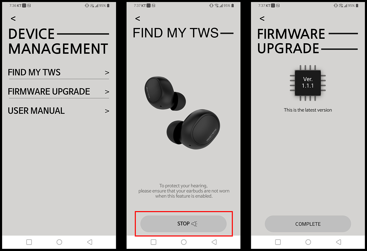 관리항목에서는 TWS를 찾을 수 있는 항목이 있습니다. 해당 기능을 처음 써봐서인지 상당히 신기하더군요. 찾기 버튼을 누르면 이어버드에서 비프음이 울리게 됩니다. 비프음이 크지는 않지만 근처에 있다면 상당히 유용하게 사용할 수 있는 기능입니다. 전용 앱이 있어서 추가적으로 펌웨어 업데이트 역시 편리하게 사용할 수 있습니다. (현재는 최신 버전이네요.)