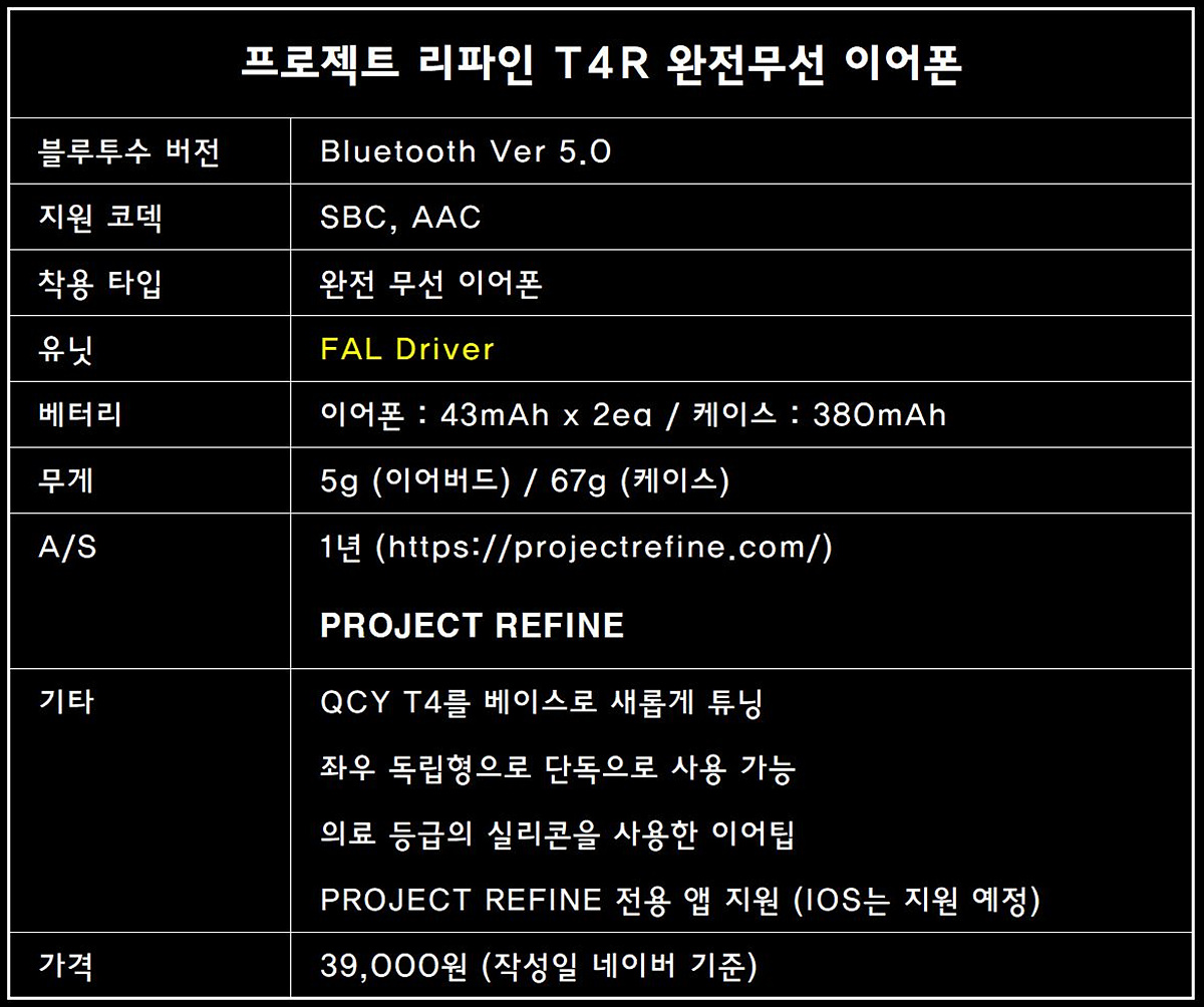 프로젝트 리파인 T4R의 스펙을 간단히 정리해보았습니다. 정제, 제련, 개선 이라는 뜻을 가진 Refine 이름만으로도 이 제품이 어떤 성격을 갖고 있는지 미루어 짐작이 가능합니다. T4R은 소개에서 언급한 QCY T4 TWS 이어폰의 하우징을 그대로 사용하지만 몇가지 개선 작업이 이루어졌습니다. 스펙에서 가장 눈에 띄는 부분은 39,000이라는 저렴한 가격과 FAL 드라이버를 사용한 부분이였는데 처음 들어보는 드라이버라서 어떤 소리를 들려줄지 상당히 궁금했습니다.