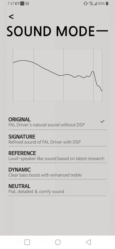 5가지의 사운드 모드는 상당히 좋았지만 사용자 EQ를 지원하지 않는 부분은 아쉬웠습니다. 제작사에서 어떤 의도인지는 잘 모르겠지만 시그니처에 조금씩만 EQ를 수정할 수 있는 기능이 있었다면 정말 좋았을거라 생각합니다. 사운드 모드에서 조절을 할 수도 있지만 제품 자체가 저음부분이 강력하거나 풍부하지는 않기때문에 저음이 강조된 소리를 좋아하는 분들에게는 아쉬울 수도 있습니다. 이 부분도 커스텀 EQ로 조금 더 보완을 할 수 있을텐데 말이죠. 현재는 지원하고 있지 않지만 앞으로는 이런 부분도 추가가 될 수도 있을거라 생각합니다. (꼭 되면 좋겠습니다.)