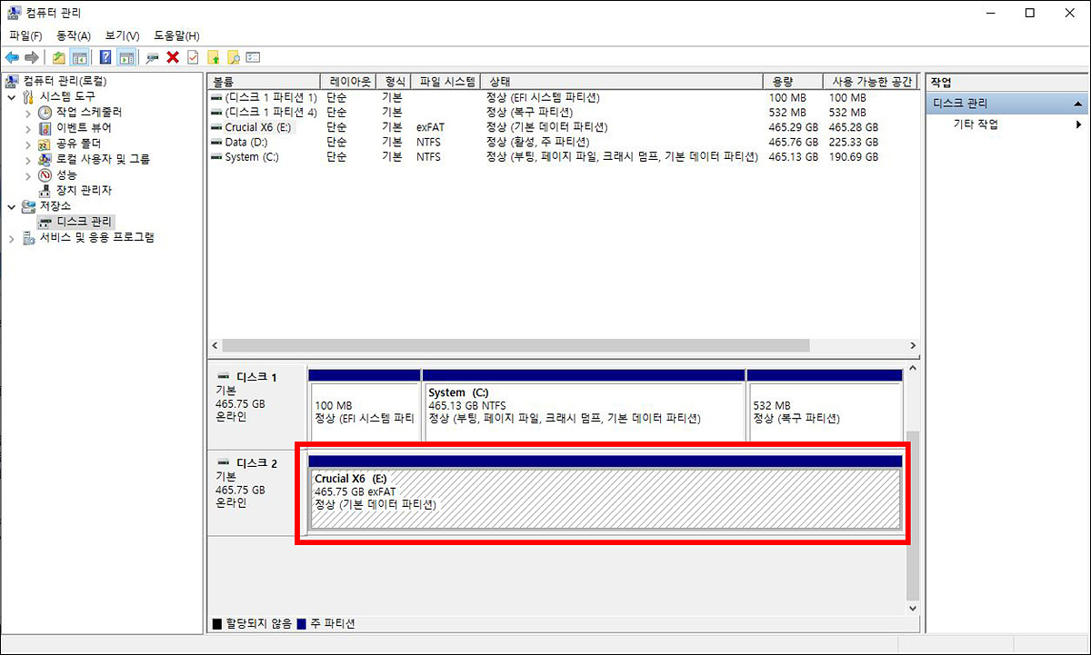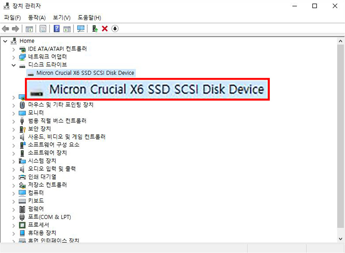 USB 케이블만 연결하면 장치관리자에서 X6 SSD를 확인할 수 있습니다. 외장 저장장치들은 HDD나 SSD 모두 기본적으로 파티션이 할당되어있기 때문에 따로 설정을 할 필요가 없습니다.