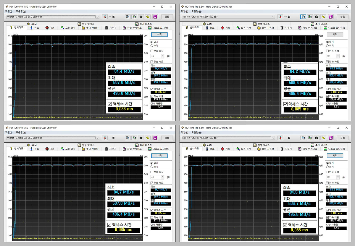 HD Tune의 평균속도 역시 튀지 않고 일정한 읽기 속도를 보여주었습니다.