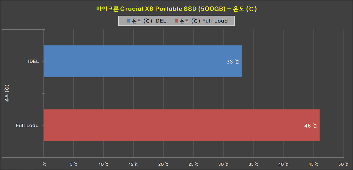 알루미늄 히트 싱크를 사용해서인지 온도 역시 상당히 좋은 결과를 보여주었습니다. SSD에서 온도가 높아지면 쓰로틀링으로 속도가 떨어질 수 있는데 이런 걱정은 없을듯 합니다.