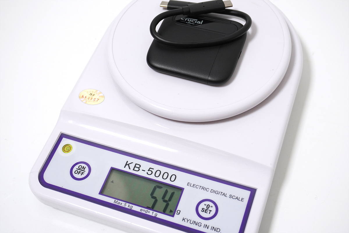 손바닥 위에 올려놓 수 있을만큼 작은 크기에 케이블을 포함한 무게는 54g으로 휴대성은 정말 좋습니다. SSD 안써본 사람은 있어도 한번만 써본 사람은 없다고 표현을 하는데 이 말은 외장에서도 그대로 적용될거 같습니다.