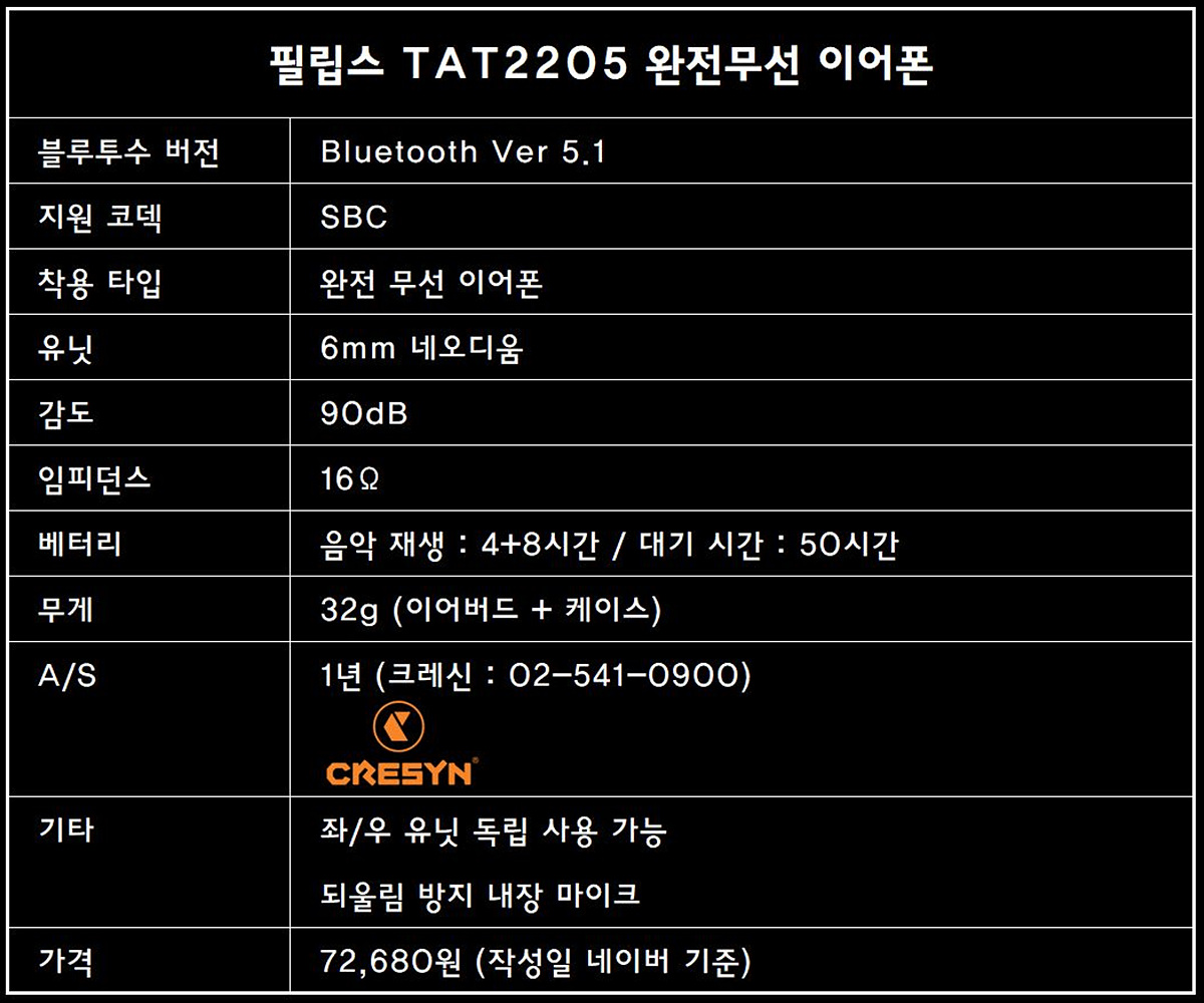 TAT2205 블루투스 이어폰의 스펙을 간단히 정리해보았습니다. 스펙상으로는 크게 눈에 띄는 부분없이 무난한 성능을 보여주었습니다. 개인적으로 스펙보다는 필립스 이어폰의 공식 유통과 고객지원을 크레신에서 담당하고 있다는 부분이 가장 눈에 띄더군요. (개인적으로는 많이 좋아하는 브랜드입니다.)