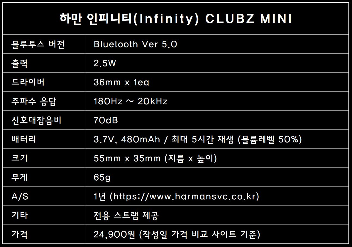 인피니티 CLUBZ MINI 블루투스 스피커의 스펙을 간단히 정리해보았습니다. 2만원 중반대로 보급형 라인의 제품으로 스펙 역시 고음질을 추구하는 하이파이(Hi-Fi) 스피커와는 방향이 많이 다른 제품입니다. 5.5cm의 지름과 65g의 무게를 보면 이 제품의 성격을 확실히 알 수 있죠. HARMAN, AKG, JBL 브랜드는 삼성에서 인수했지만 고객지원에 대한 부분은 기존 삼성센터에서 이루어지지 않습니다. 제품의 접수는 가능하지만 직접적인 수리나 상담은 하만 오디오 전문 서비스 센터에서 처리를 하고 있으니 홈페이지를 꼭 확인해보세요.