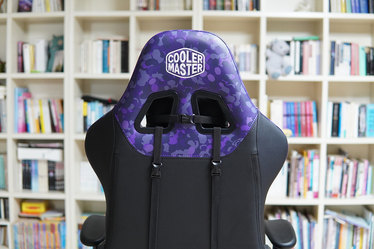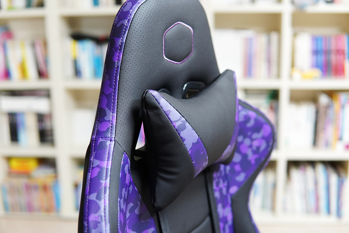 앞쪽은 육각형 모양만 있지만 뒤쪽에는 쿨러마스터 로고까지 인쇄되어 있습니다. 등받이 쿠션은 저와 아들의 취향이 달랐지만 헤드 쿠션의 취향은 둘 모두 없는 편이 좀 더 좋았습니다. 쿠션을 달면 목을 뒤로 젖히거나 스트레칭을 할때 걸리적거리더군요.