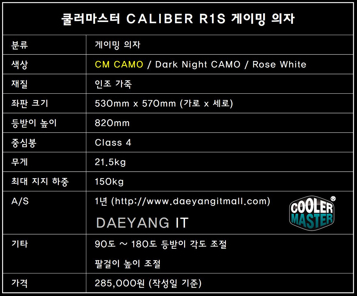 쿨러마스터 CALIBER R1S CM 게이밍 체어는 이런 부분에 있어서 확실하게 소비자들의 이목을 끌 수 있는 카모 제품을 출시를 했습니다. 하지만 이 제품은 이목을 끄는데까지만 성공을 하고 호응이나 실제 판매까지로 이어지기는 힘들거라 생각합니다. 제가 디자인적인 센스가 뛰어나거나 하진 않지만 그래도 이번 디자인은 너무 많이 앞서갔다는 생각이 들었습니다.