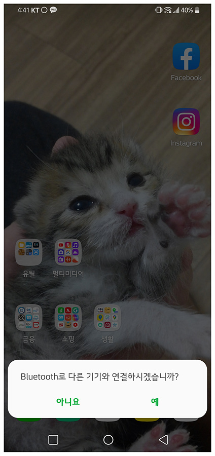 페어링은 수동뿐 아니라 NFC를 통해서도 쉽고 빠르게 사용할 수 있습니다. NFC 기능을 활성화 한 뒤 스마트폰과 블루패럿을 가까이 하면 위처럼 안내가 나오고 "예"를 누르면 페어링이 완료됩니다.