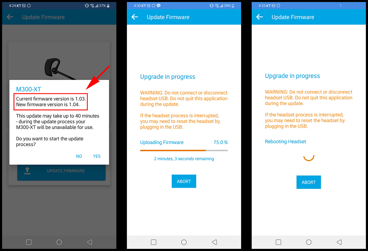 현재 기기의 펌웨어는 1.03이고 1.04로 업데이트를 할 수 있습니다. Yes를 누르면 펌웨어 업데이트는 자동으로 이루어지며 헤드셋은 재부팅이 됩니다. (안내는 40분이라고 되는데 3-4분정도 걸린거 같습니다.)