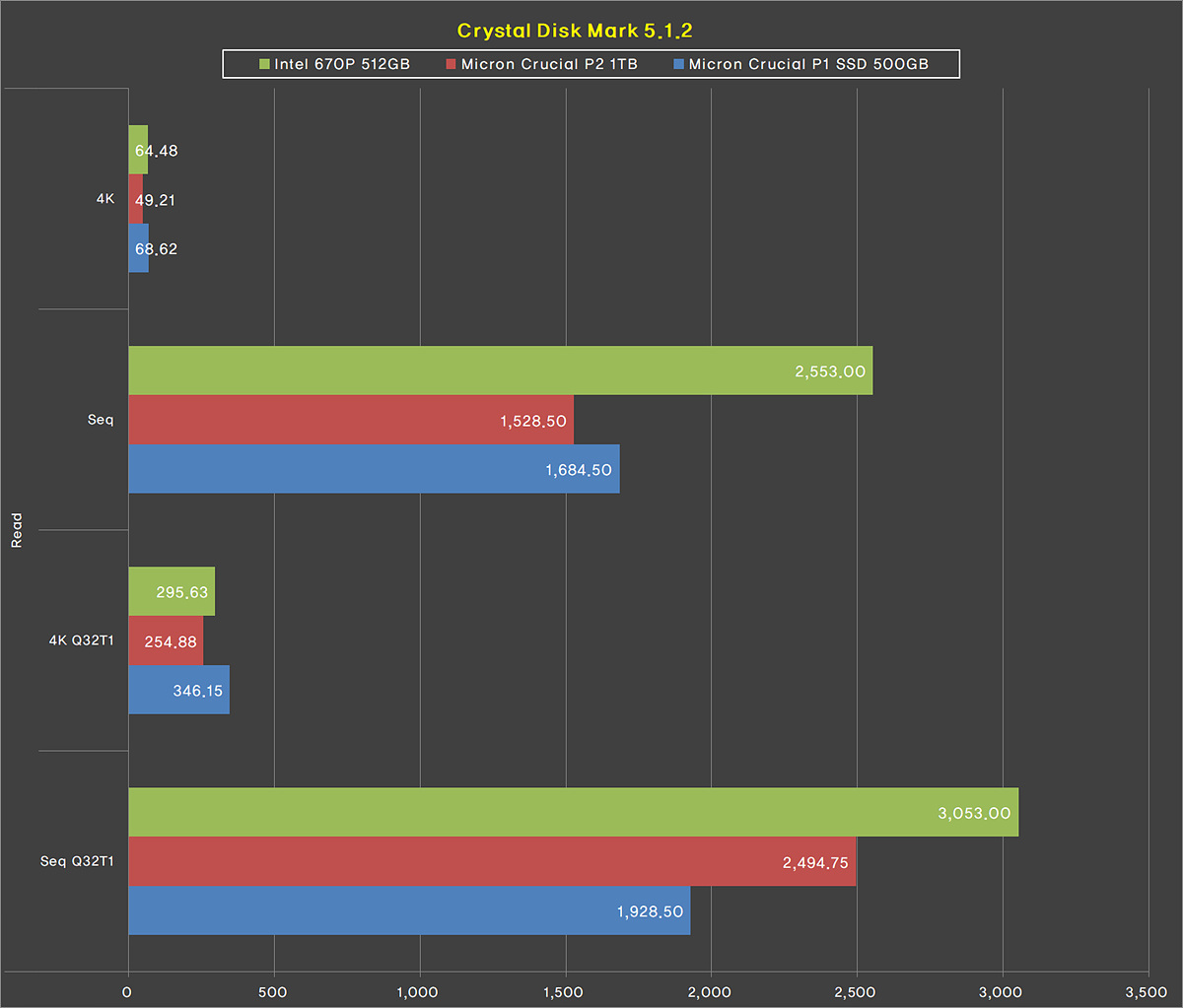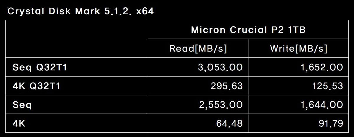 기존에 테스트했었던 마이크론 QLC SSD인 P1, P2와 비교 데이터입니다. 4K도 그렇지만 순차 읽기 능력은 압도적이라고 할 수 있을만큼이네요.