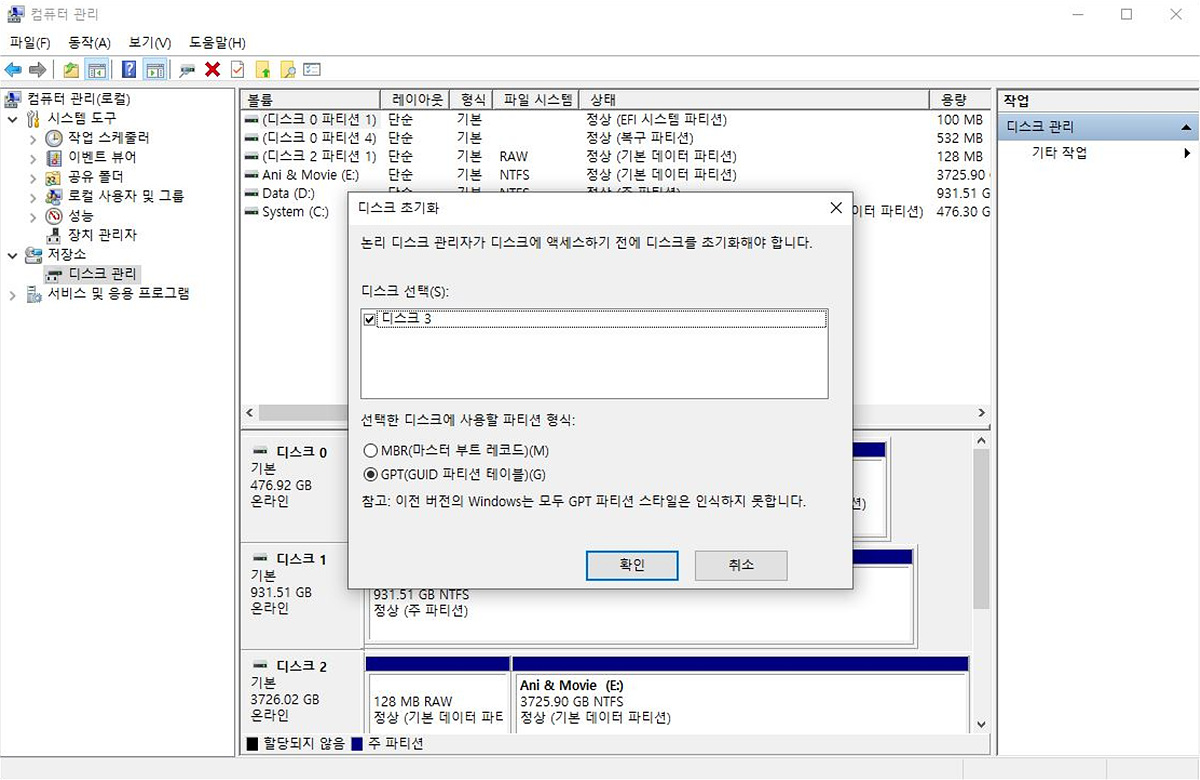 HDD, SSD와 같은 내장형 저장장치들은 별도로 볼륨을 지정해주어야 합니다.