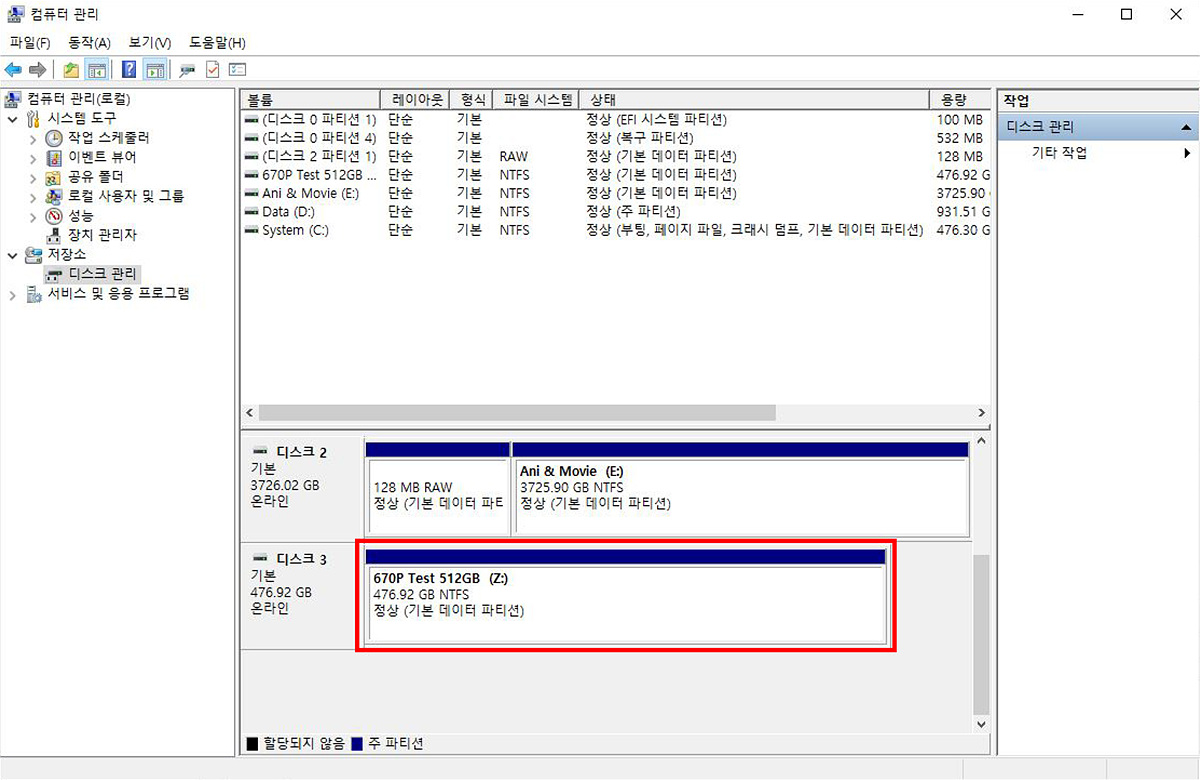 부팅후에는 장치관리자에서 SSD를 확인할 수 있습니다.