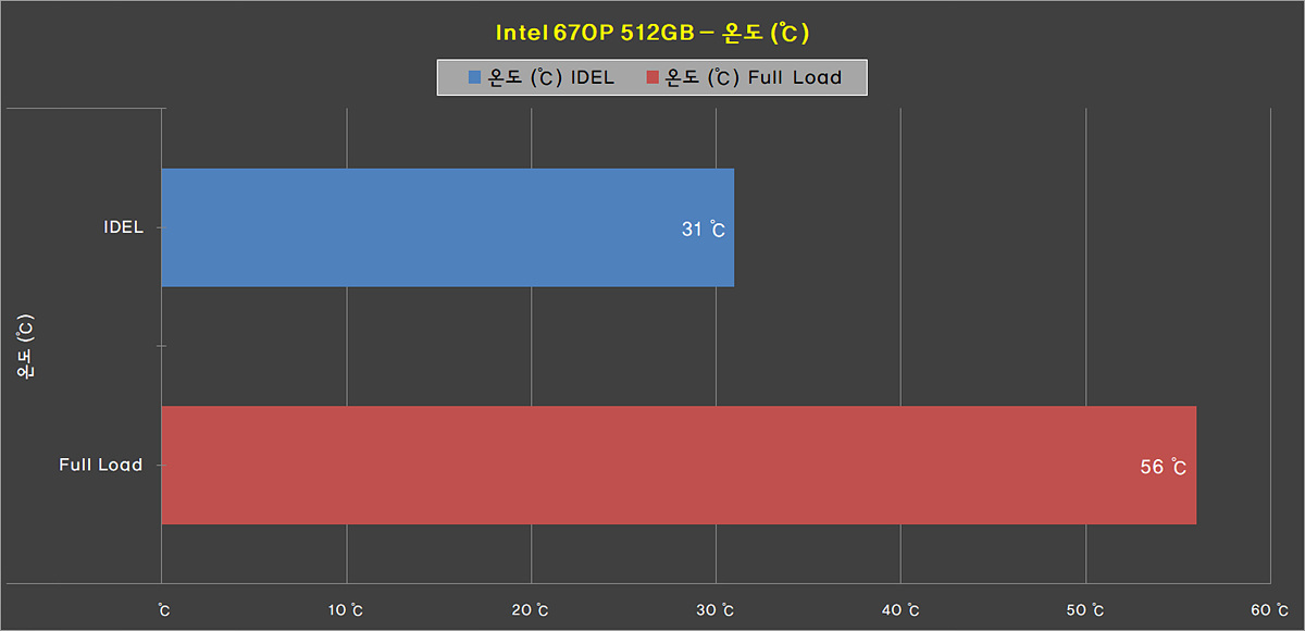 M.2 SSD의 취약점인 온도는 좋은 수준이였습니다. 방열판이 없어도 최고 온도가 56도로 상당히 좋은 편으로 이 부분 역시 NAND와 SSD의 성능에 비례하기 때문이라 생각됩니다.
