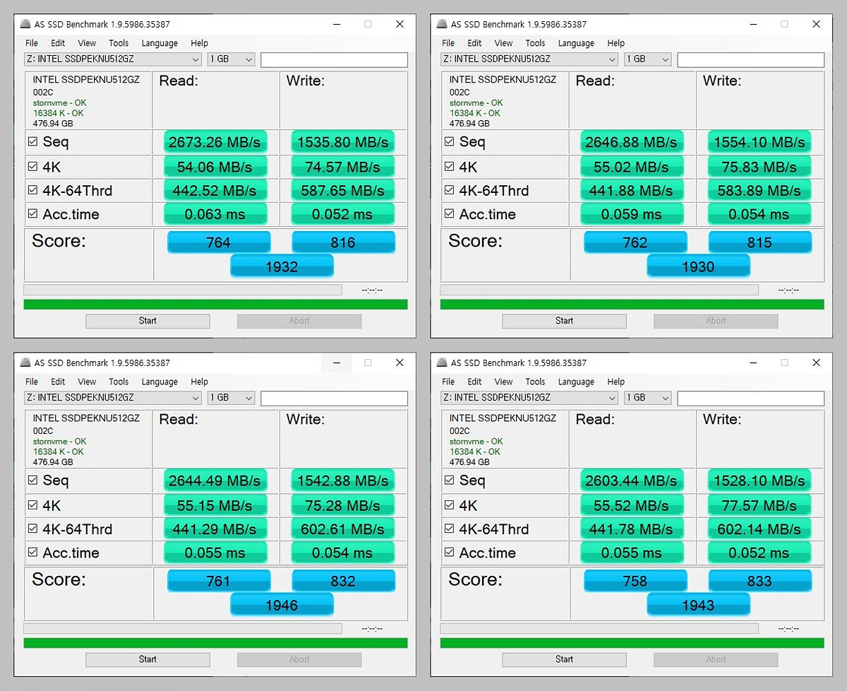 AS SSD를 4번 측정한 결괏값의 평균입니다. 이 테스트에서도 읽기 성능은 꽤 좋은 편이였지만 반대로 Access Time 항목이 조금 떨어지는 수치를 보여주었습니다.