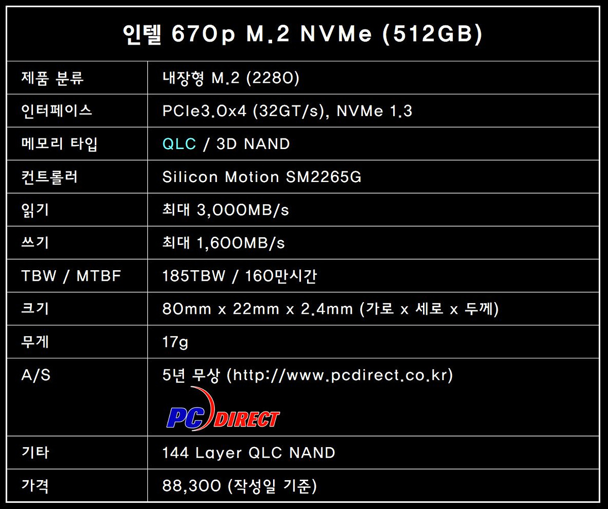 인텔 670p의 가격을 생각한다면 아직까지 개인 사용자들에게는 매력적인 제품이 아닙니다. 제품의 속도나 내구성에 있어서도 기존의 TLC보다 낮으며 일부 제품들처럼 화려한 RGB를 가지고 있지 않습니다. 인텔 670p는 MSRP가 $89.99로 상당히 높은 편입니다. 국내 판매가를 보면 오히려 공식 유통사(피씨디렉트)에서 내놓은 가격이 굉장히 파격적이라고 할 수 있을 정도입니다.