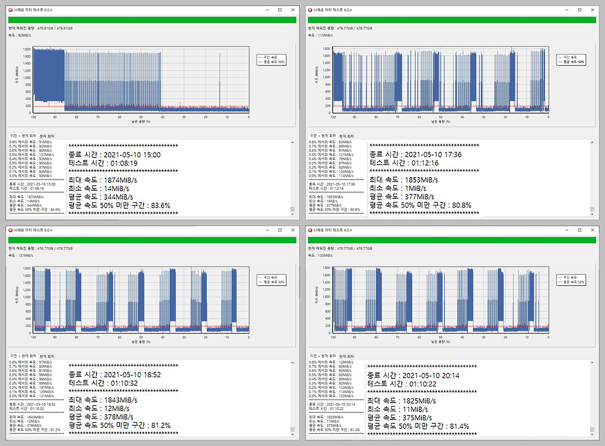 TLC 디램리스(DRAM less) 제품이나 QLC SSD들이 가장 두려워(?)하는 나래온 더티 테스트입니다. 나래 테스트의 경우 그래프를 봐도 차이를 알수 있고 테스트 시간을 비교하면 가장 확실하게 비교를 할 수 있습니다. 캐싱 구간이 끝나게 되면 속도가 많이 떨어져서 전체 테스트 시간이 상당히 오래 걸립니다.