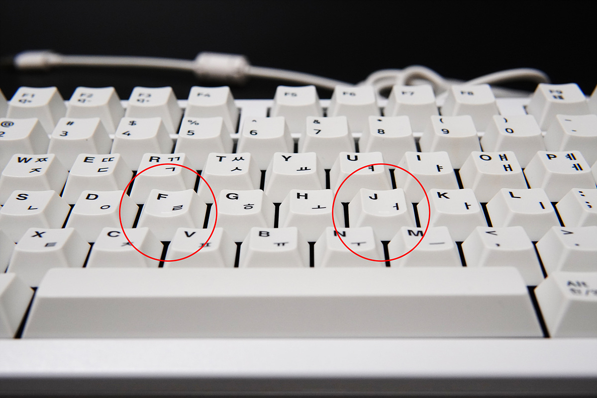 체리 키보드의 또다른 특징 중 하나는 "F", "J" 키캡의 곡선(라운드)입니다. 일반적인 키캡은 자리를 확인할 수 있는 돌기만 있지만 체리 키캡은 아랫쪽의 곡선 부분도 좀 더 둥글게 되어있습니다.