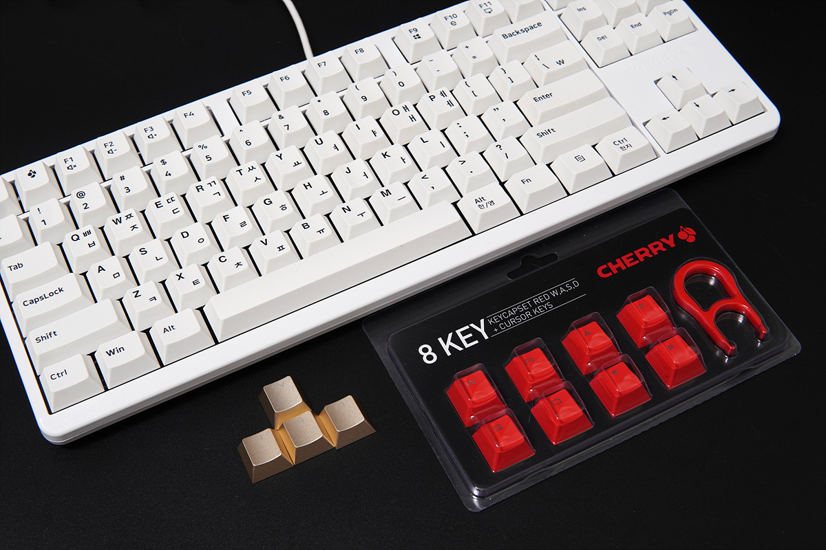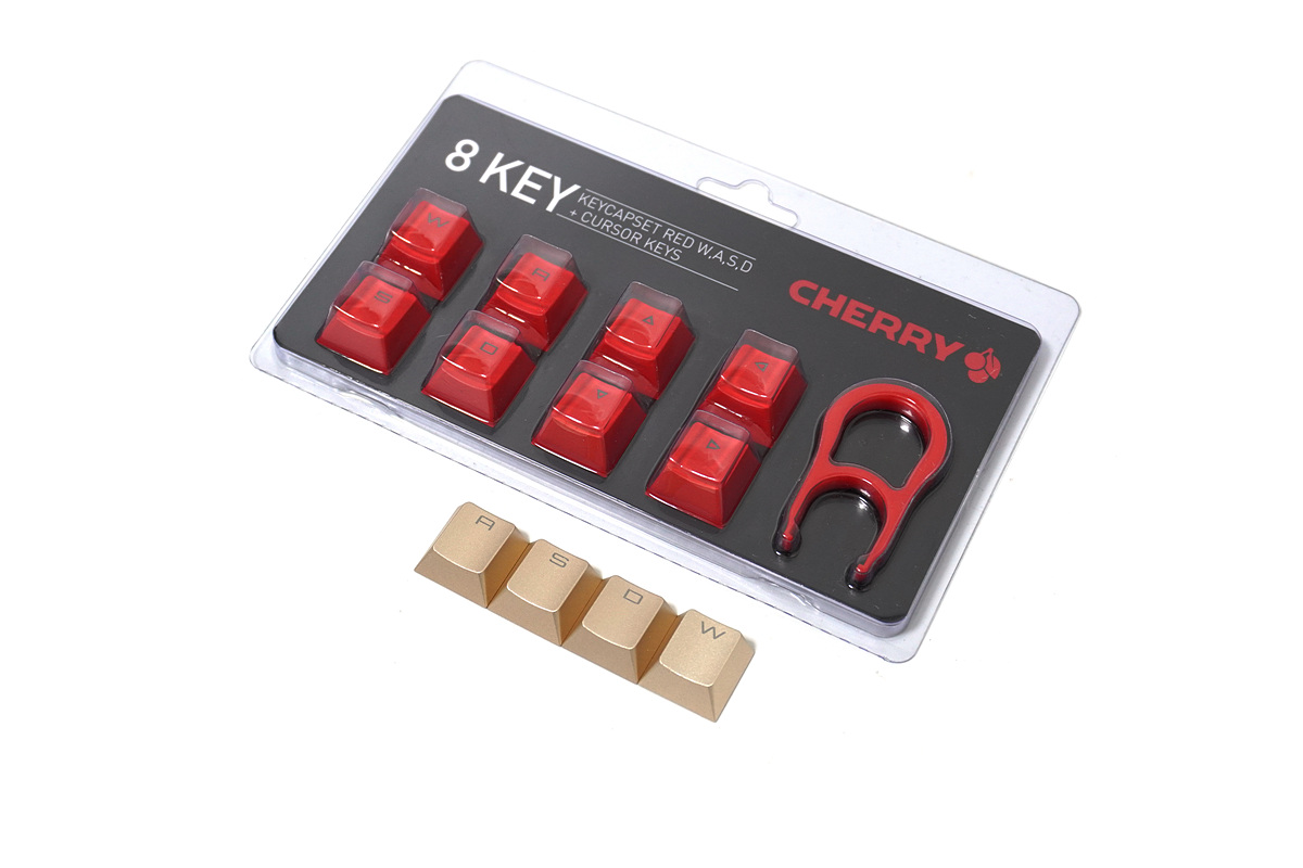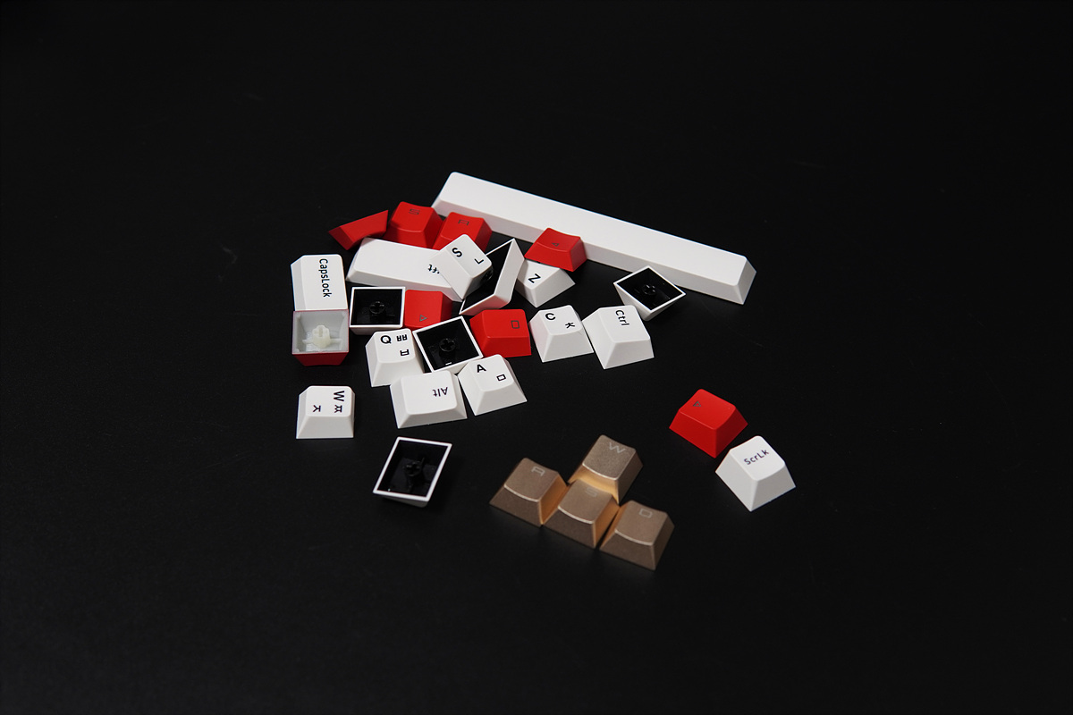 이번 테스트에는 두가지 포인트 키캡을 같이 제공 받았습니다. 금색의 W / A / S / D 키캡은 알루미늄 재질이며 빨간색의 8개 키캡은 이중사출의 ABS 재질로 되어있습니다.