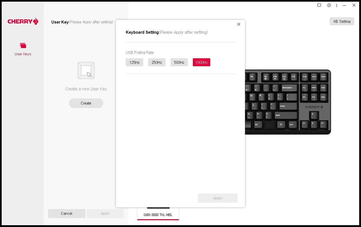 KB Setting을 통해 폴링 레이트를 변경할 수 있습니다.