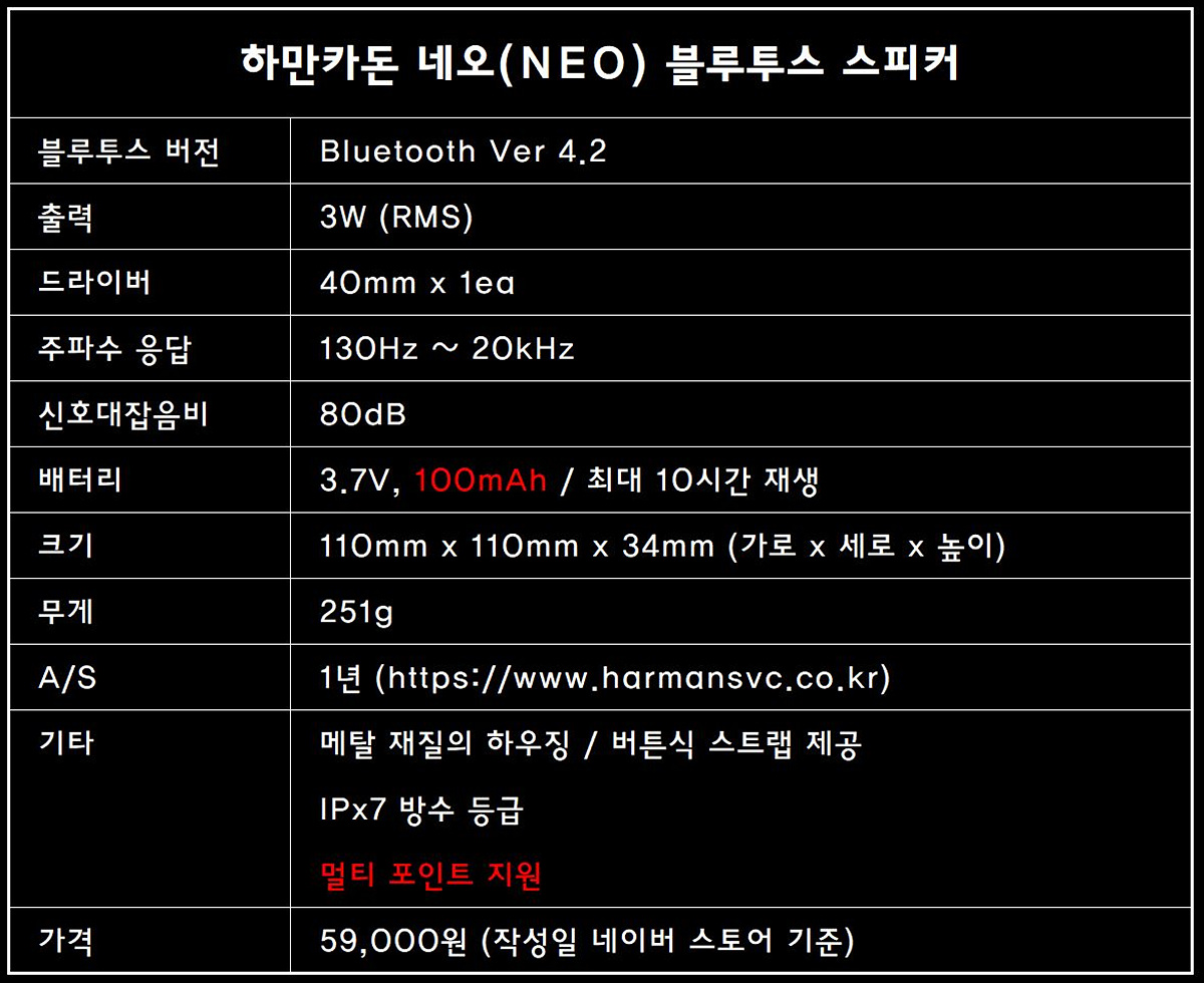 하만카돈 NEO 블루투스 스피커의 스펙을 간단히 정리해보았습니다. 스펙상에서 빨간색으로 표시된 부분중 배터리 용량은 아마도 스펙을 표기하면서 오타나 실수가 있었던거 같습니다. 이정도 크기의 스피커가 10시간 사용하는데 100mAh는 너무나 작은 용량이죠. 마지막에 "0"이 한개 빠졌거나 앞에 숫자가 한개 빠졌을거라 생각됩니다. 추가로 멀티 포인트 기능 역시 스펙이나 상세 설명에서는 빠져있었는데 제품을 테스트하다 우연히 발견하게 되었습니다. 멀티 페어링도 아니고 멀티 포인트 기능처럼 유용한 부분을 왜 빠트렸는지 궁금하네요.