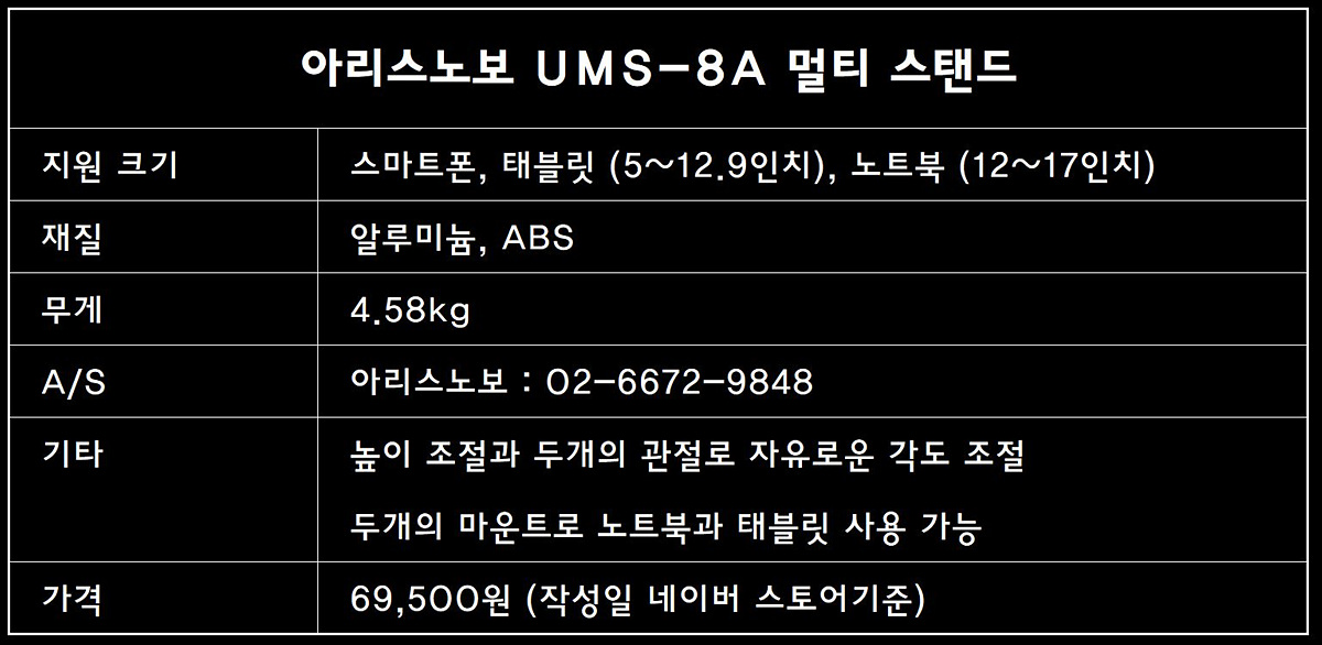 아리스노보 멀티 스탠드의 스펙을 간단히 정리해보았습니다. UMS-8A 멀티 스탠드는 이름처럼 스마트폰, 태블릿, 노트북 모두 사용할 수 있는 제품입니다. 기존에 스탠드라면 책상에 올려두거나 클램프 방식으로 어딘가에 고정을 해야만 사용할 수 있었습니다. 침대 위에서 사용하는 미니 테이블과 같은 제품들도 사용할 수 있었지만 노트북이나 태블릿을 올려두면 가끔씩 불안한 상황이 생길때도 있더군요. 특히나 고양이나 강와지와 같은 반려동물과 함께 생활하는 분들이라면 테이블 위에 둔 물건들이 떨어지는 경험을 자주 겪게 됩니다.