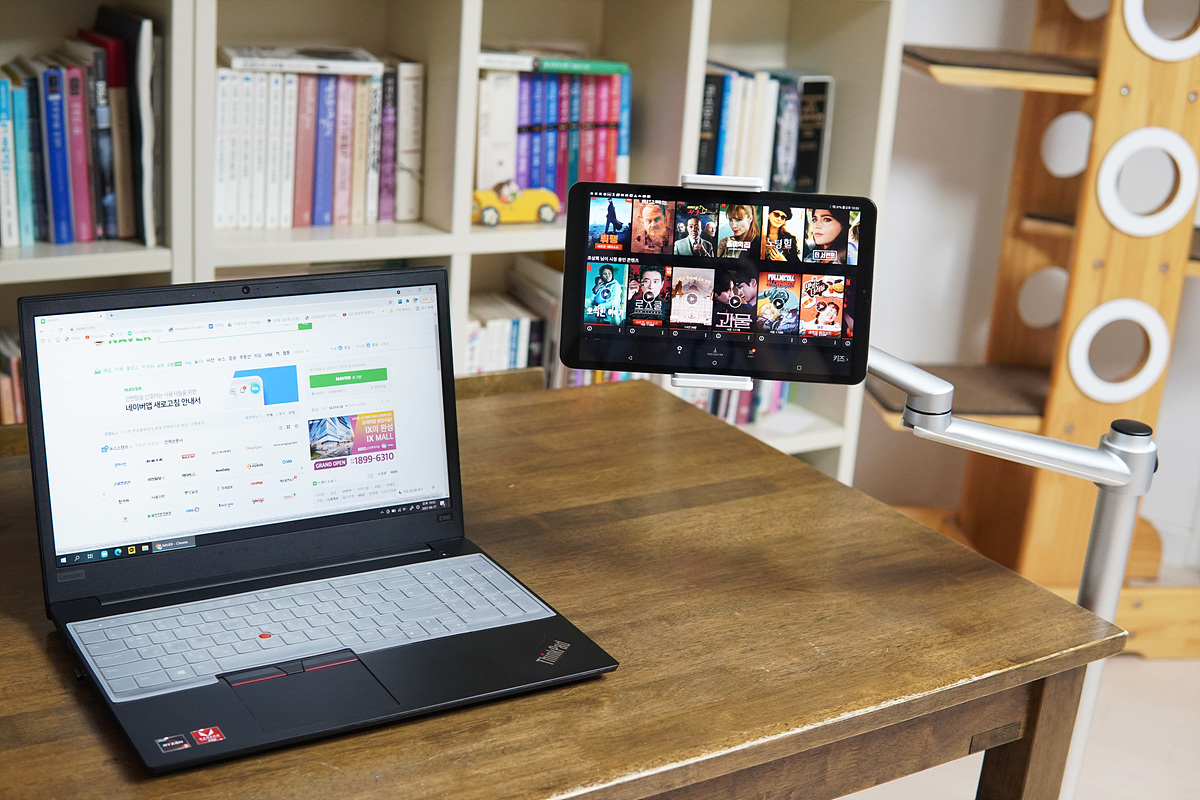 책상이 좁은 분들이라면 이렇게 노트북과 태블릿을 동시에 사용할 수도 있습니다. 노트북이 아니더라도 소파에서 TV를 보면서 태블릿을 편리하게 사용할 수도 있습니다. 사진의 태블릿은 LG GPad5로 10.1인치 크기입니다.
