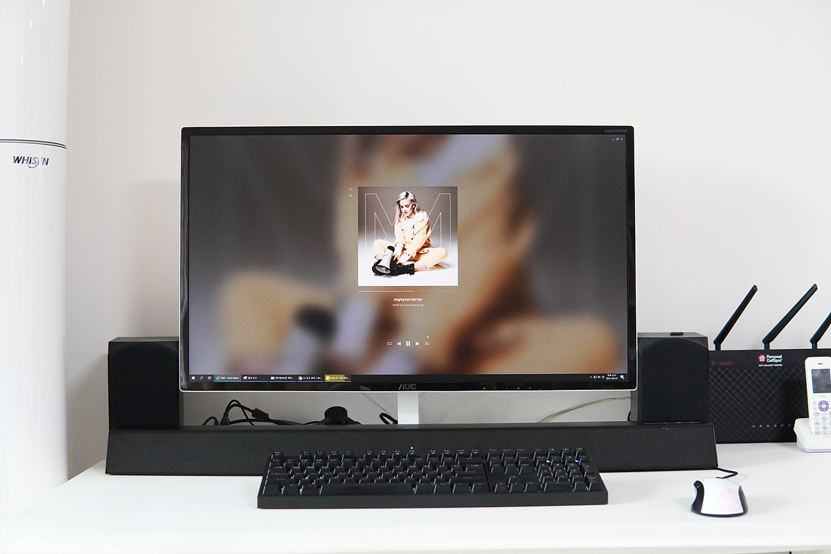 실제는 이 영상보다 소리가 훨씬 더 묵직하며 단단한 소리를 들려줍니다. TV 스피커로만 음악을 들었던 분들이라면 확연하게 달라진 소리를 경험하실 수 있습니다. PC는 3.5mm AUX로 스마트폰과는 블루투스로 연결을 하였습니다. 블루투스의 경우 스마트폰의 볼륨과 스피커의 볼륨을 각각 따로 조절할 수 있기때문에 일반적인 블루투스 스피커의 소리보다 훨씬 더 크게 음악을 감상할 수 있습니다. 사운드바에서 많이 지적되는 부분인 스테레오 이미지 부분 역시 좁게 느껴지지는 않았습니다.