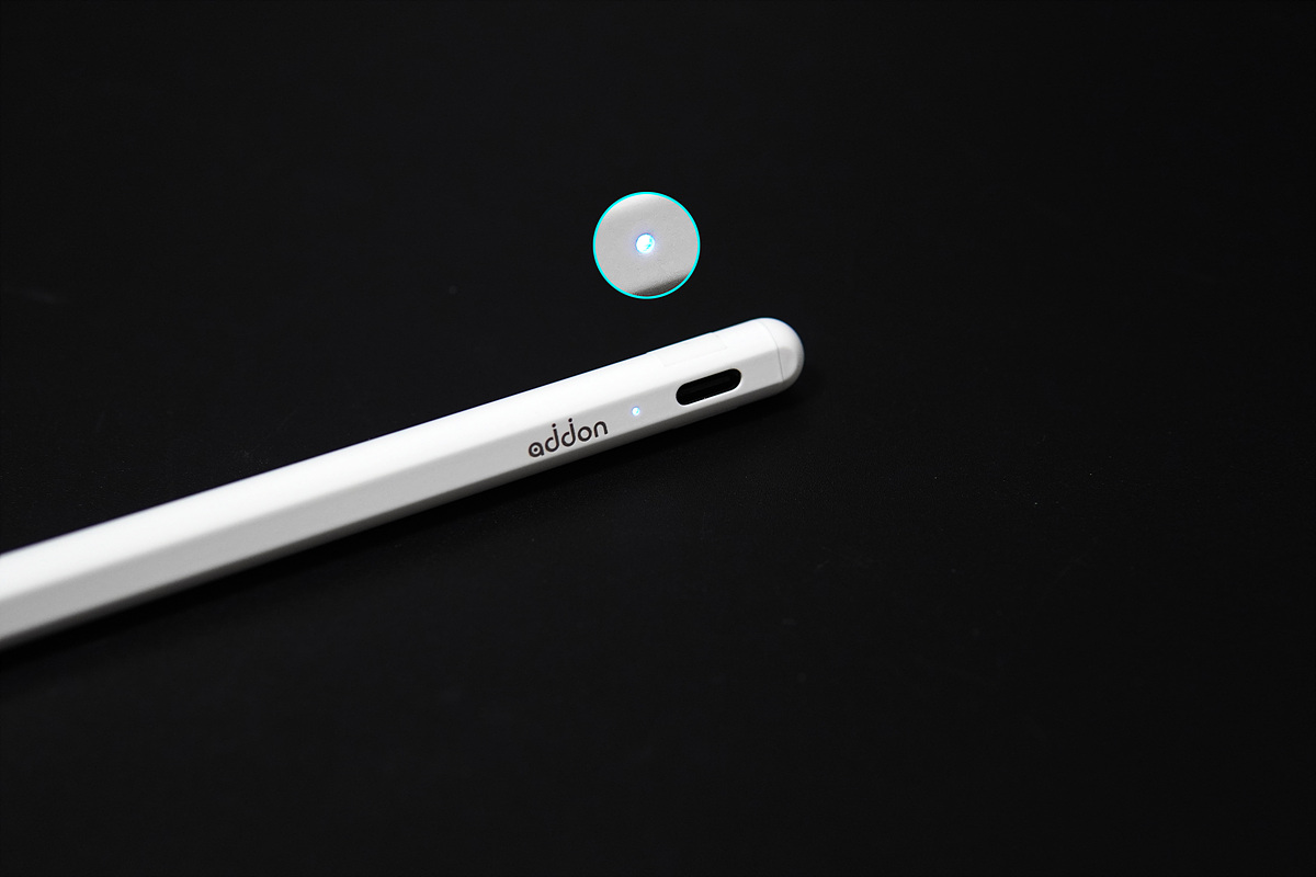 충전단자 아래쪽에는 LED가 있어서 aPen의 현재 상태를 확인할 수 있습니다. 사용 중에는 파란색으로 충전 중에는 빨간색으로 켜지며 충전이 완료되면 LED는 꺼집니다. 20분 동안 사용하지 않을 때에도 전원이 꺼지게 됩니다.