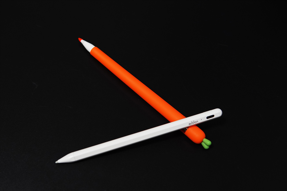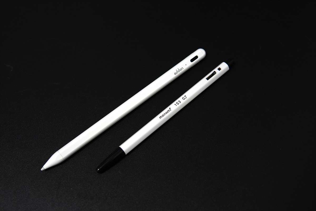 현재 사용 중인 애플 펜슬 1세대와의 비교 사진입니다. 애플 펜슬에 비해 길이는 살짝 짧고 굵기 역시 조금 더 가는 편입니다. 애플 펜슬에 실리콘 커버를 씌운 상태라 차이가 좀 더 커 보이네요.