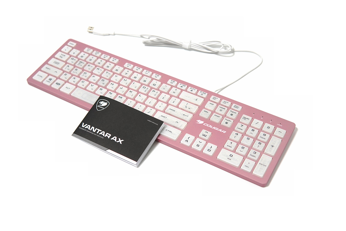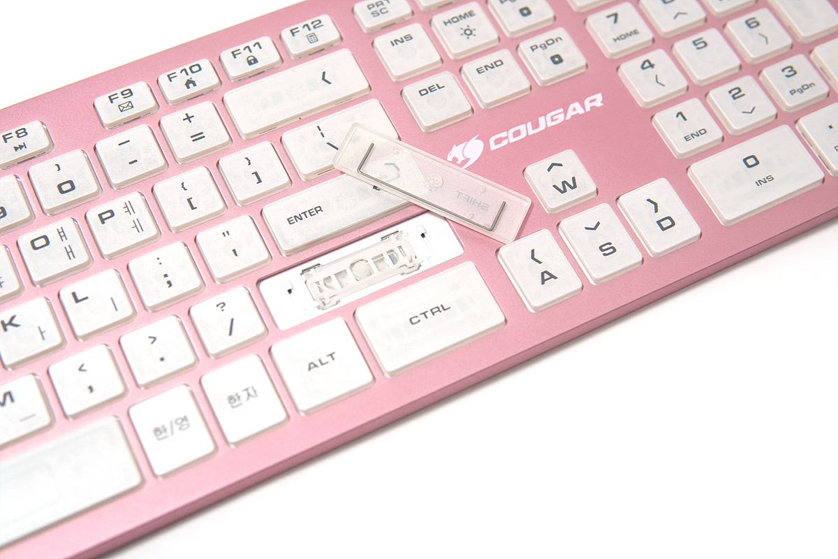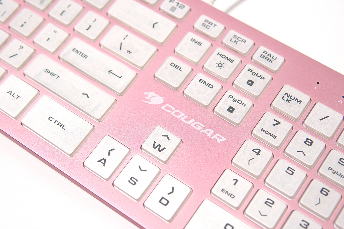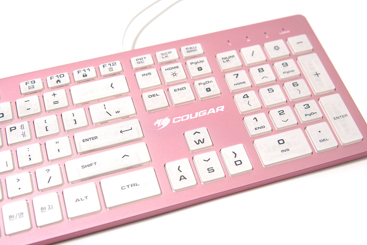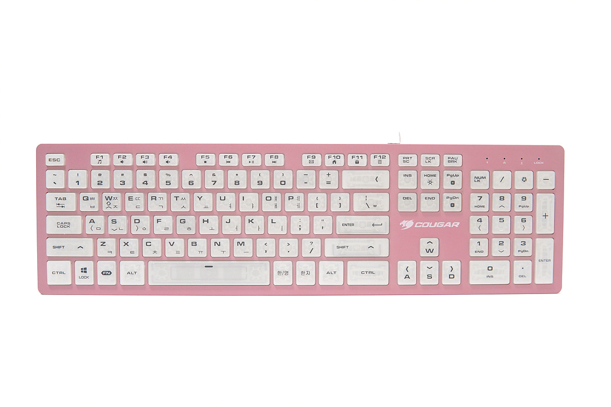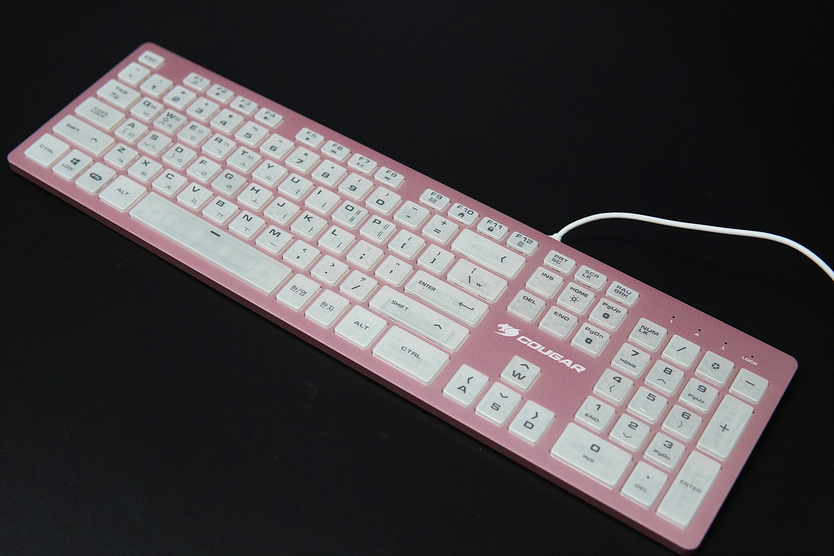 멤브레인이나 기계식 키보드와는 다른 디자인과 독특한 키감 때문에 펜타그래프 방식의 키보드 역시 마니아층이 제법 많은 편입니다. 이런 펜타 방식에 눈에 확~~ 띄는 핑크색의 알루미늄 하우징은 더욱 시선을 집중시키고 있습니다. 논란의 민트 초코처럼 실제로는 호불호가 많이 갈릴 거라 생각합니다. 그래서인지 이런 제품을 출시한 쿠거(COUGAR)에 용기에 키보드를 좋아하는 사용자로서는 박수를 쳐주고 싶습니다.
